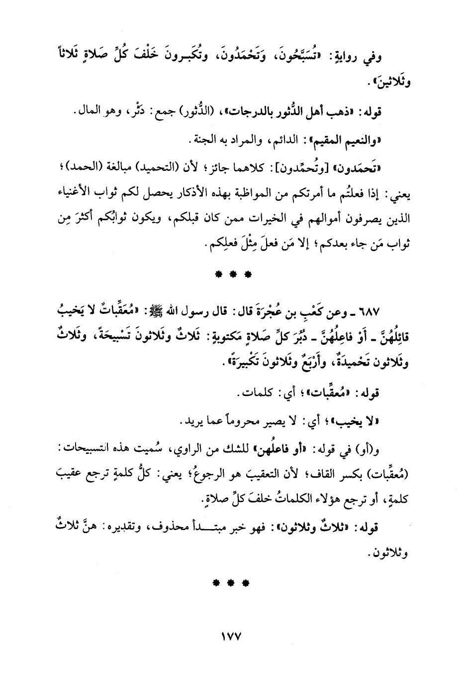 687 - وعن كَعْبِ بن عُجْرَةَ قال: قال رسول الله - صلى الله عليه وسلم -: "مُعَقِّباتٌ لا يَخيبُ قائِلُهُنَّ - أَوْ فاعِلُهُنَّ - دُبُرَ كلِّ صَلاةٍ مَكتوبةٍ: ثَلاثٌ وثَلاثونَ تَسْبيحَةً، وثَلاثٌ وثَلاثون تَحْميدَةٌ، وأَرْبَعٌ وثَلاثونَ تَكْبيرَةً".