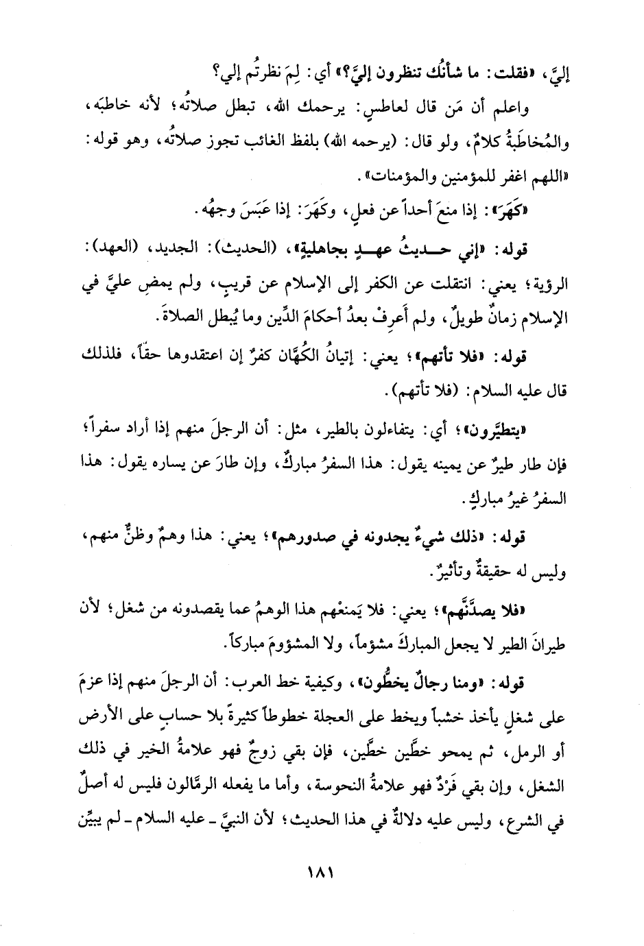 قوله: "إني حديثُ عهدٍ بجاهليةٍ"، (الحديث): الجديد، (العهد): الرؤية؛ يعني: انتقلت عن الكفر إلى الإسلام عن قريبٍ، ولم يمضِ عليَّ في الإسلام زمانٌ طويلٌ، ولم أَعرِفْ بعدُ أحكامَ الدَّين وما يُبطل الصلاةَ.
