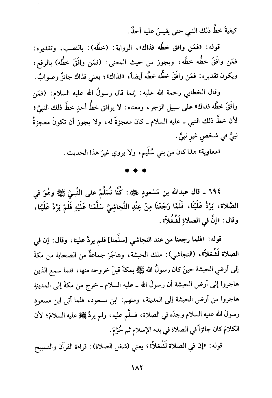 694 - قال عبد الله بن مَسْعودٍ - رضي الله عنه -: كُنَّا نُسَلِّمُ على النَّبيِّ - صلى الله عليه وسلم - وهُوَ في الصَّلاة، يَرُدُّ عَلَيْنَا، فَلَمَّا رَجَعْنَا مِنْ عِنْدِ النَّجاشِيِّ سَلَّمْنا عَلَيْهِ فَلَمْ يَرُدَّ عَلَيْنا، وقال: "إنَّ في الصلاةِ لَشُغُلًا".