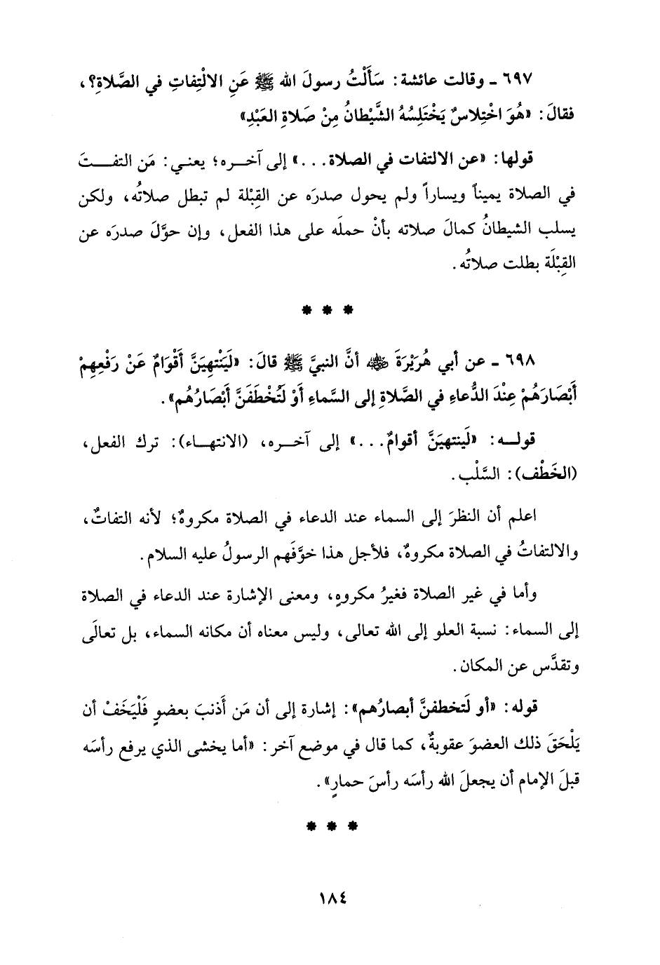 697 - وقالت عائشة: سَأَلْتُ رسولَ الله - صلى الله عليه وسلم - عَنِ الالْتِفاتِ في الصَّلاةِ؟، فقالَ: "هُوَ اخْتِلاسٌ يَخْتَلِسُهُ الشَّيْطانُ مِنْ صَلاةِ العَبْدِ"