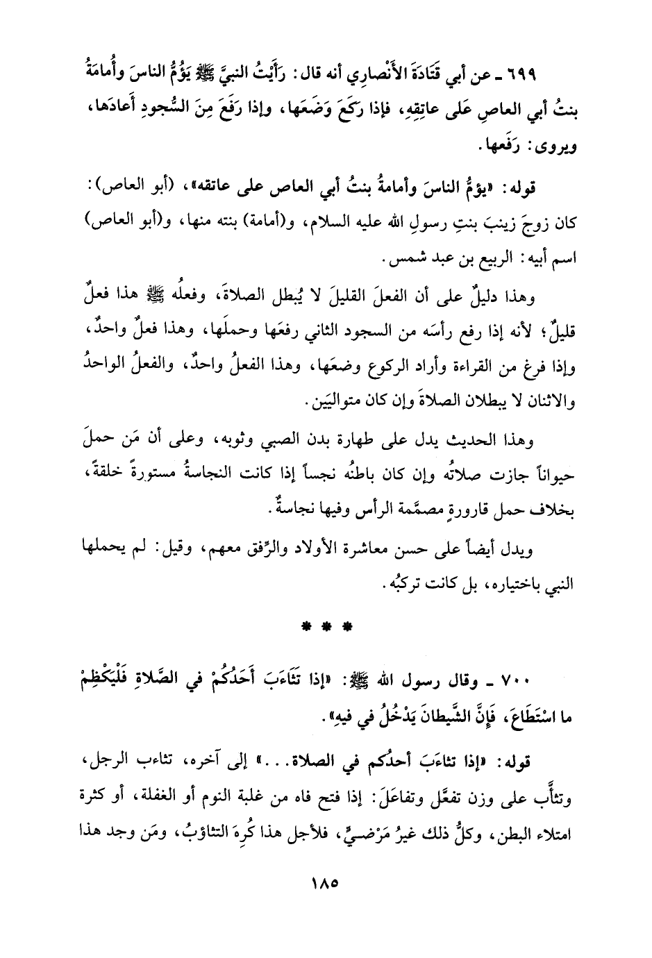 699 - عن أبي قَتَادَةَ الأَنْصارِي أنه قال: رَأَيتُ النبيَّ - صلى الله عليه وسلم - يَؤُمُّ الناسَ وأُمامَةُ بنتُ أبي العاصِ عَلى عاتِقِهِ، فإذا رَكَعَ وَضَعَها، وإذا رَفَعَ مِنَ السُّجودِ أَعادَها، ويروى: رَفَعها.