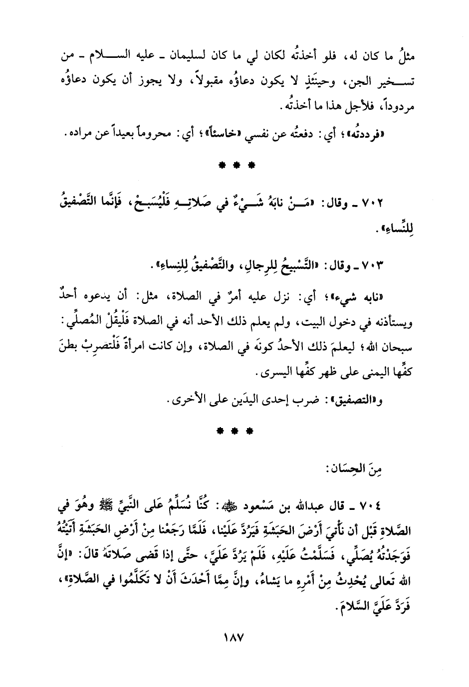703 - وقال: "التَّسْبيحُ لِلرِجالِ، والتَّصْفيقُ لِلنِساءِ".