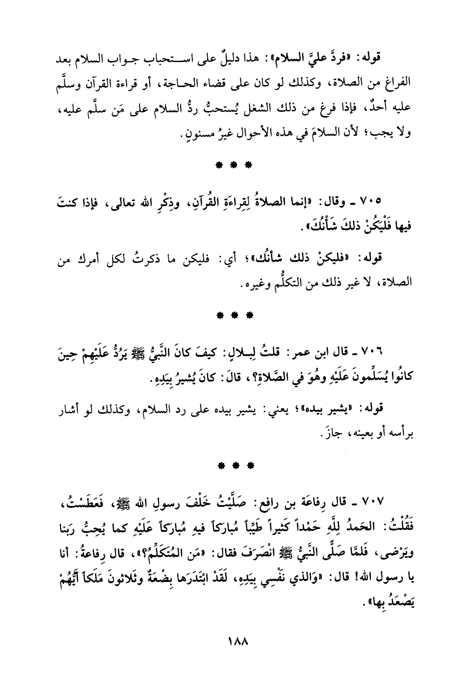 706 - قال ابن عمر: قلتُ لِبلالٍ: كيفَ كانَ النَّبيُّ - صلى الله عليه وسلم - يَرُدُّ عَلَيْهِمْ حِينَ كانُوا يُسَلِّمونَ عَلَيْهِ وهُوَ في الصَّلاةِ؟، قالَ: كانَ يُشيرُ بِيَدِهِ.