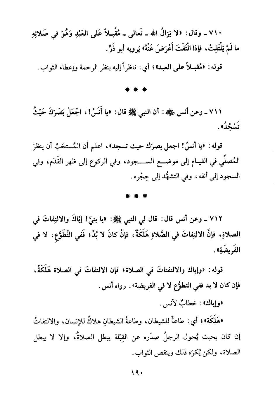 712 - وعن أنس قال: قال لي النبي - صلى الله عليه وسلم -: "يا بنيَّ! إيَّاكَ والالتِفاتَ في الصلاةِ، فإنَّ الالتِفاتَ في الصَّلاةِ هَلَكَةٌ، فإنْ كانَ لا بُدَّ؛ فَفي التَّطَوُّعِ، لا في الفَريضَةِ".