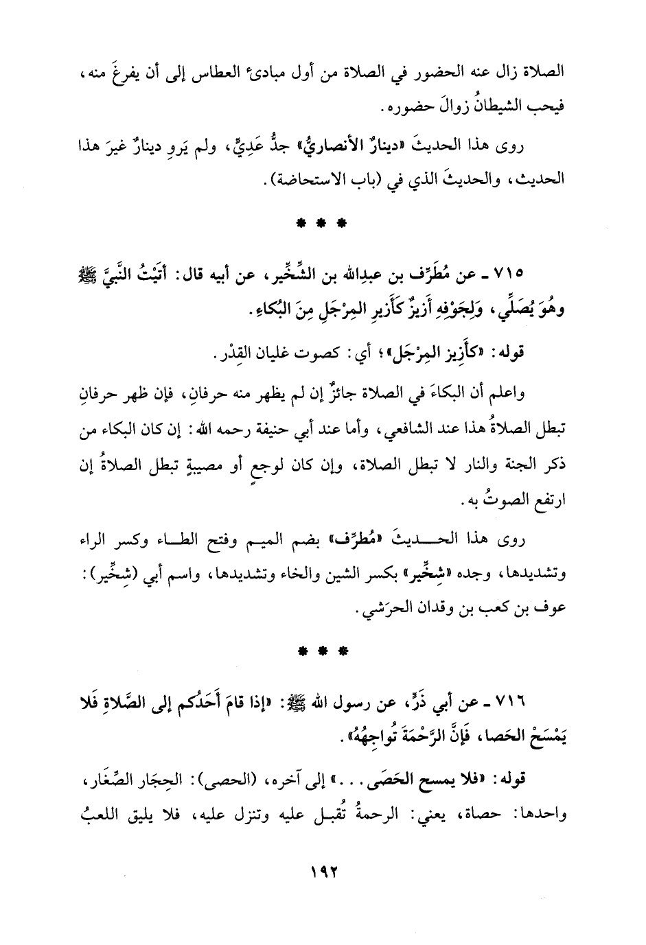 715 - عن مُطَرِّف بن عبدِ الله بن الشِّخِّير، عن أبيه قال: أتَيْتُ النَّبيَّ - صلى الله عليه وسلم - وهُوَ يُصَلِّي، وَلِجَوْفِهِ أَزيزٌ كَأزيزِ المِرْجَلِ مِنَ البُكاءِ.
