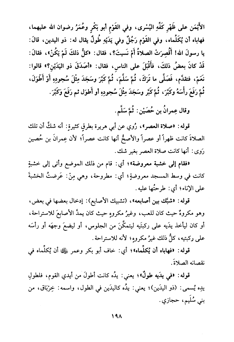 الأَيْمَن على ظَهْرِ كَفِّهِ اليُسْرى، وفي القَوْمِ أبو بَكْرٍ وعُمَرُ رضوان الله عليهما، فهاباه أن يُكَلِّماه، وفي القَوْم رَجُلٌ وفي يَدَيْهِ طُولٌ يقال له: ذو اليدين، قالَ: يا رسولَ الله! أَقُصِرَتْ الصلاةُ أَمْ نَسيتَ؟، فقال: "كلُّ ذلكَ لَمْ يَكُنْ"، فقالَ: قَدْ كانَ بعضُ ذلكَ، فأَقْبَلَ على الناسِ، فقال: "أصدَقَ ذو اليَدَيْنِ؟ " قالوا: نَعَمْ، فتقدَّم، فَصَلَّى ما تَرَكَ، ثُمَّ سَلَّمَ، ثُمَّ كَبَّرَ وسَجَدَ مِثْلَ سُجودِهِ أَوْ أَطْوَلَ، ثُمَّ رَفَعَ رأْسَهُ وكَبَّرَ، ثُمَّ كَبَّر وسَجَدَ مِثْلَ سُجودِهِ أو أَطوَل ثم رَفَعَ وَكَبَّرَ.