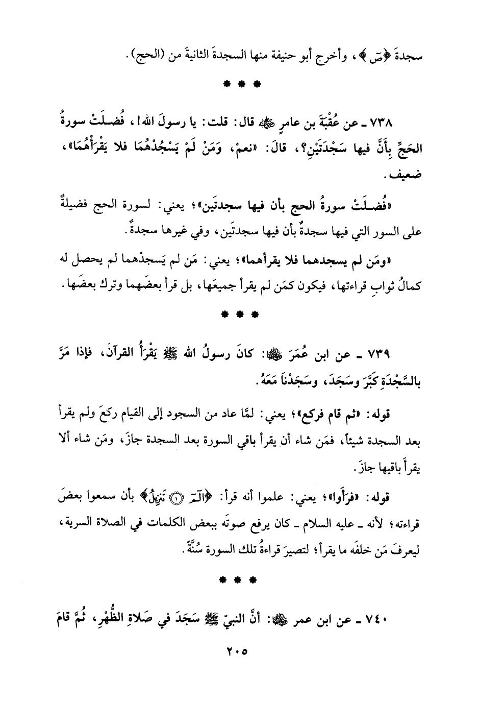 738 - عن عُقْبَةَ بن عامرٍ - رضي الله عنه - قال: قلت: يا رسولَ الله!، فُضلَتْ سورةُ الحَجِّ بِأَنَّ فيها سَجْدَتَيْنِ؟، قالَ: "نعمْ، وَمَنْ لَمْ يَسْجُدْهُمَا فلا يَقْرَأْهُمَا"، ضعيف.