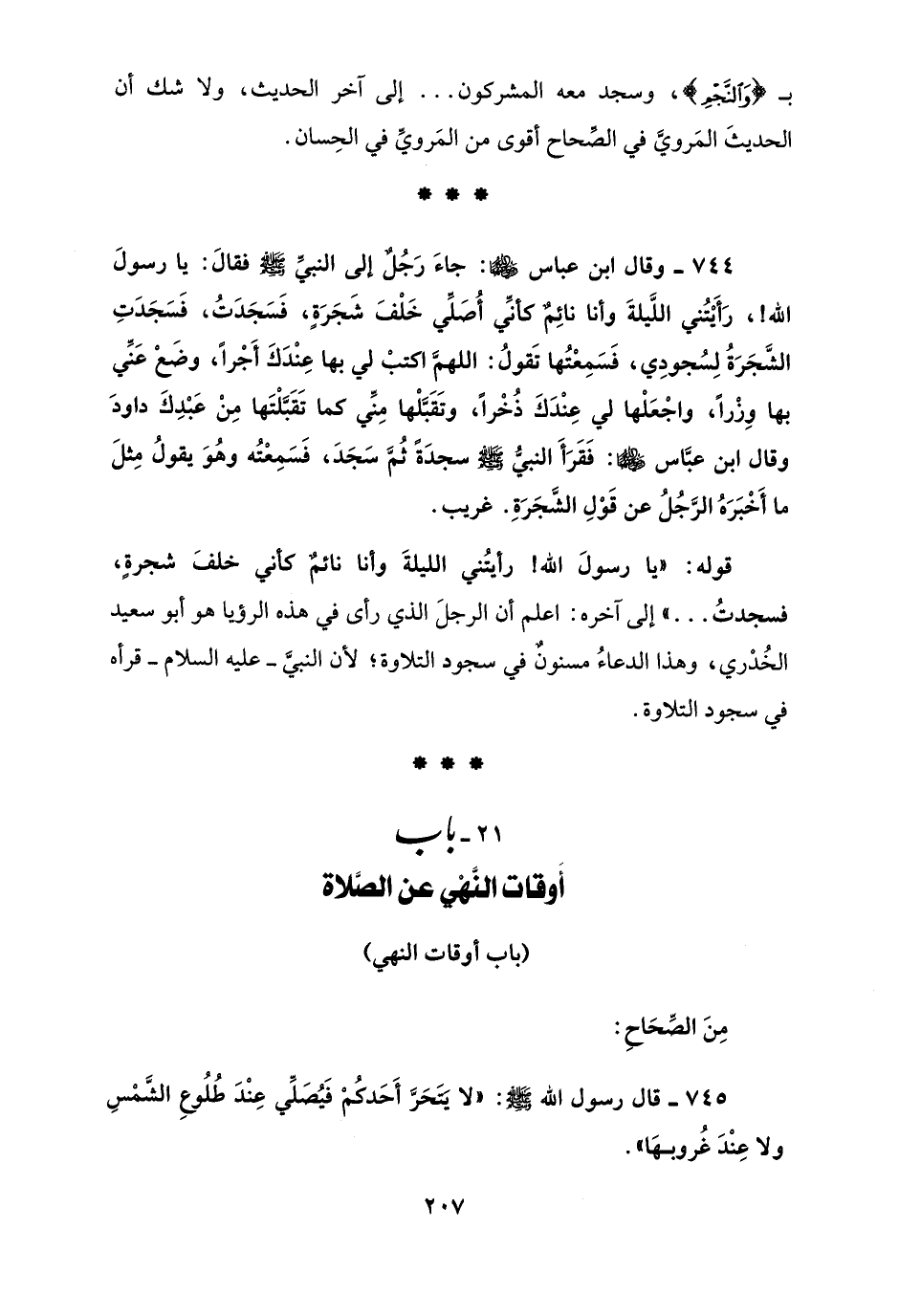 744 - وقال ابن عباس - رضي الله عنهما -: جاءَ رَجُلٌ إلى النبيِّ - صلى الله عليه وسلم - فقالَ: يا رسولَ الله!، رَأَيْتُني اللَّيلةَ وأنا نائِمٌ كأنِّي أُصَلِّي خَلْفَ شَجَرَةٍ، فَسَجَدَتُ، فَسَجَدَتِ الشَجَرَةُ لِسُجودِي، فَسَمِعْتُها تَقولُ: اللهمَّ اكتبْ لي بها عِنْدَكَ أَجْرًا، وضَعْ عَنِّي بها وِزْرًا، واجْعَلْها لي عِنْدَكَ ذُخْرًا، وتَقَبَّلْها مِنِّي كما تَقَبَّلْتَها مِنْ عَبْدِكَ داودَ وقال ابن عبَّاس - رضي الله عنهما -: فَقَرَأَ النبيُّ - صلى الله عليه وسلم - سجدَةً ثُمَّ سَجَدَ، فَسَمِعْتُه وهُوَ يقولُ مِثلَ ما أَخْبَرَهُ الرَّجُلُ عن قَوْلِ الشَّجَرَةِ. غريب.