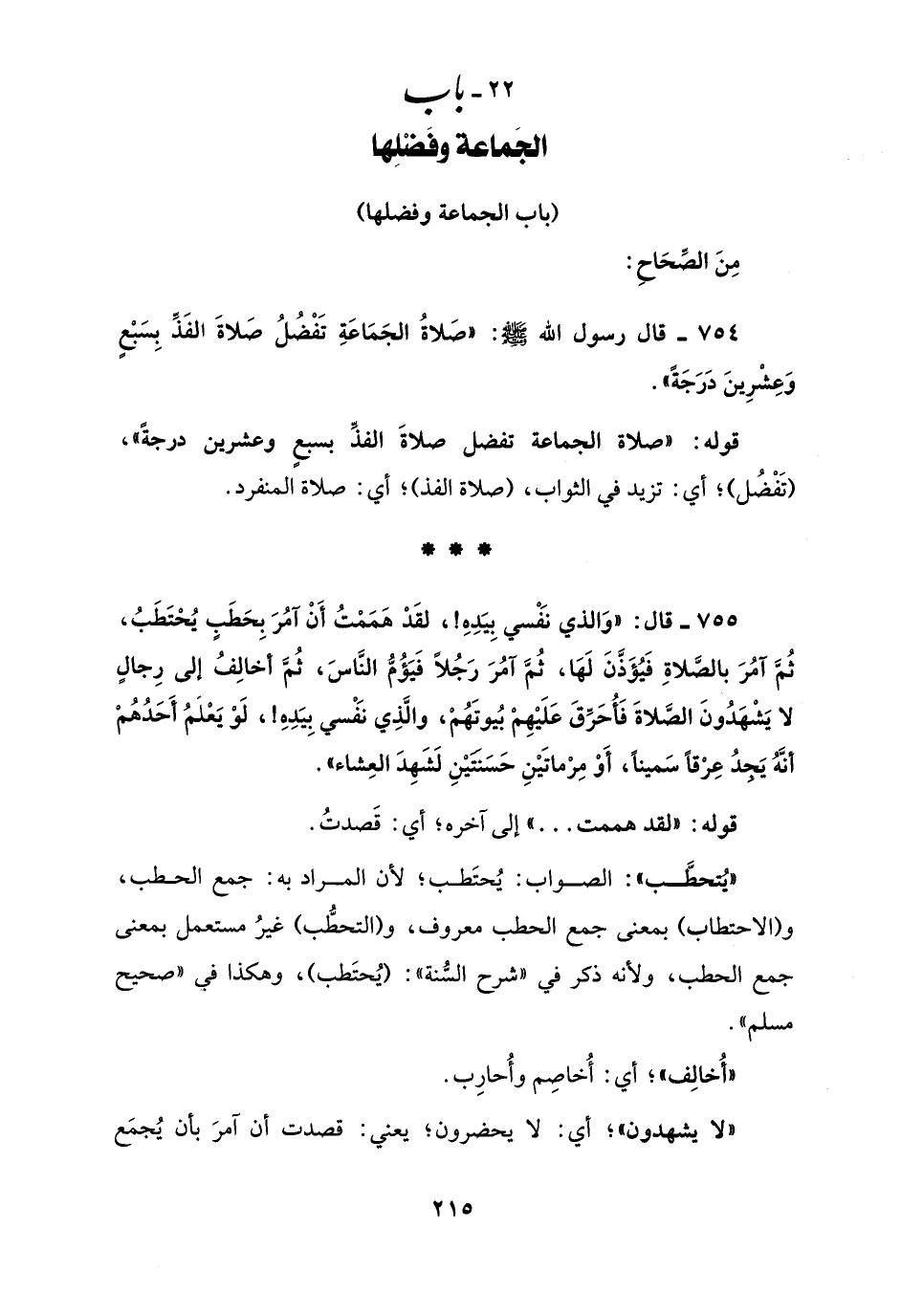 755 - قال: "وَالذي نَفْسي بِيَدِهِ!، لقَدْ هَمَمْتُ أَنْ آمُرَ بِحَطَبٍ يُحْتَطَبُ، ثُمَّ آمُرَ بالصَّلاةِ فَيُؤَذَّنَ لَهَا، ثُمَّ آمُرَ رَجُلًا فَيَؤُمُّ النَّاسَ، ثُمَّ أخالِفُ إلى رِجالٍ لا يَشْهَدُونَ الصَّلاةَ فَأُحَرِّقَ عَلَيْهِمْ بُيوتَهُمْ، والَّذِي نَفْسي بِيَدِهِ!، لَوْ يَعْلَمُ أَحَدُهُمْ أنَّهُ يَجدُ عِرْقًا سَمينًا، أَوْ مِرْماتَيْنِ حَسَنَتَيْنِ لَشَهِدَ العِشاء".