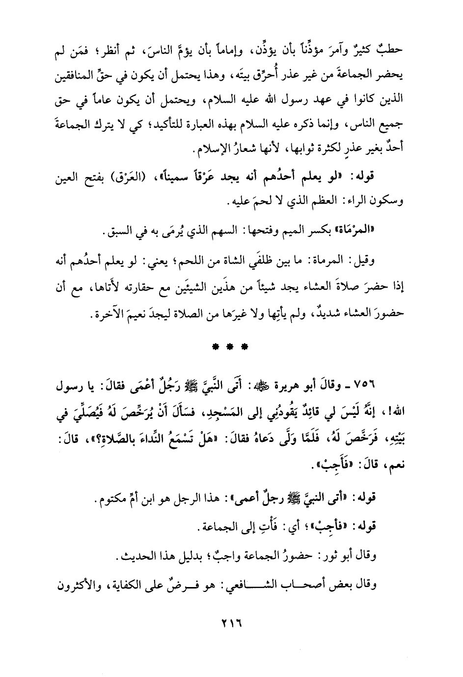 حطبٌ كثيرٌ وآمرَ مؤذِّنًا بأن يؤذِّن، وإمامًا بأن يؤمَّ الناسَ، ثم أنظر؛ فمَن لم يحضر الجماعةَ من غير عذر أُحرِّق بيتَه، وهذا يحتمل أن يكون في حقِّ المنافقين الذين كانوا في عهد رسول الله عليه السلام، ويحتمل أن يكون عامًا في حق جميع الناس، وإنما ذكره عليه السلام بهذه العبارة للتأكيد؛ كي لا يترك الجماعةَ أحدٌ بغير عذرٍ لكثرة ثوابها، لأنها شعارُ الإسلام.
