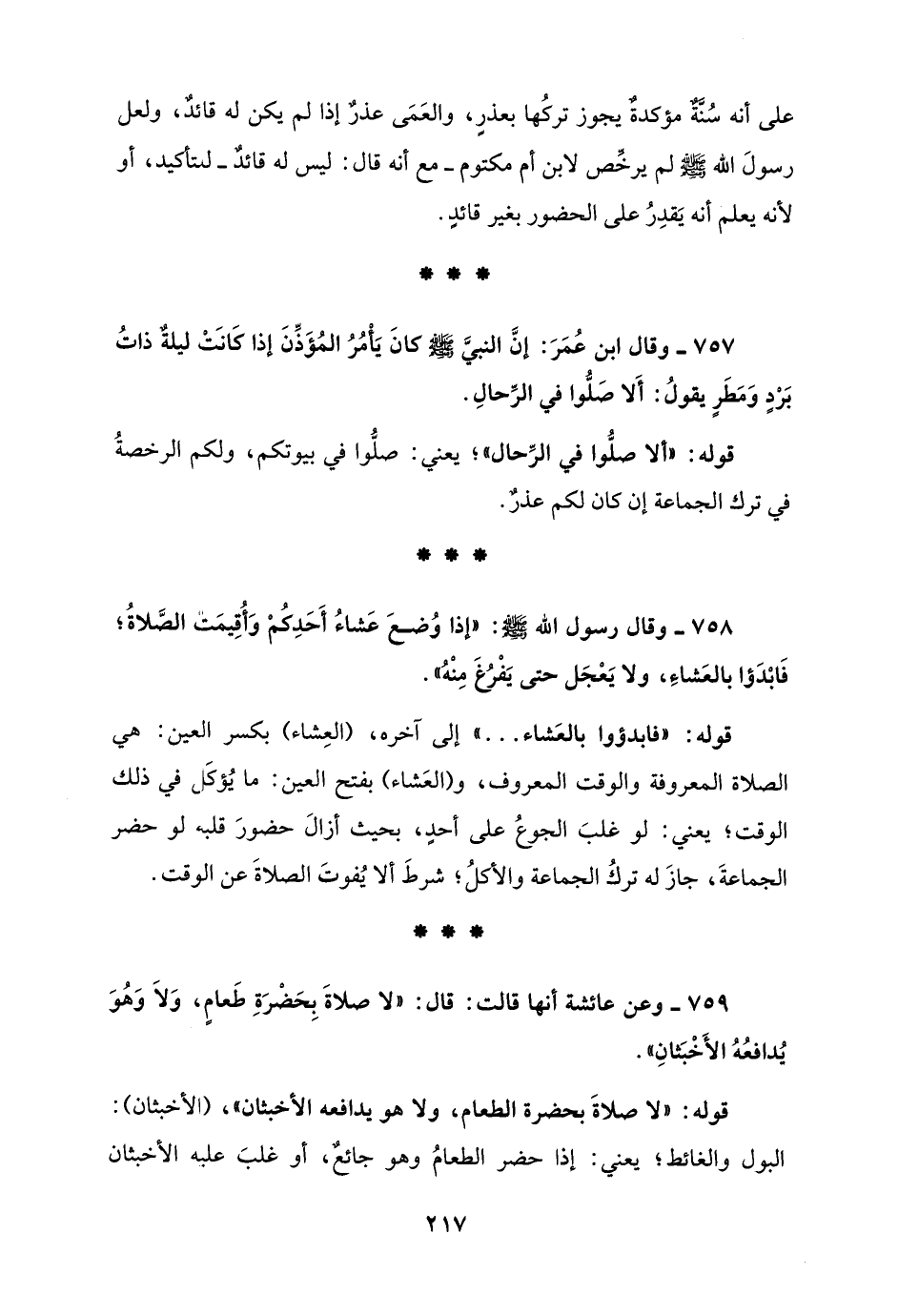 759 - وعن عائشة أنها قالت: قال: "لا صلاةَ بِحَضْرَةِ طَعامٍ، وَلَا وَهُوَ يُدافعُهُ الأَخْبَثانِ".