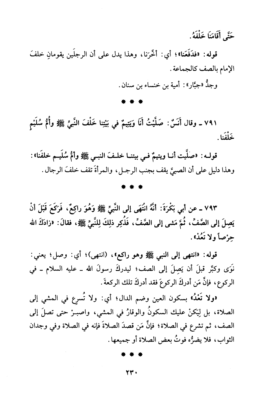 793 - عن أبي بَكْرَةَ: أنَّهُ انْتَهَى إلى النَّبيِّ - صلى الله عليه وسلم - وَهُوَ راكِعٌ، فَرَكَعَ قَبْلَ أنْ يَصِلَ إلى الصَّفِّ، ثُمَّ مَشى إلى الصَّفِّ، فَذُكِر ذلِكَ لِلنَّبيِّ - صلى الله عليه وسلم -، فقالَ: "زادَكَ الله حِرْصًا ولا تَعُدْ".