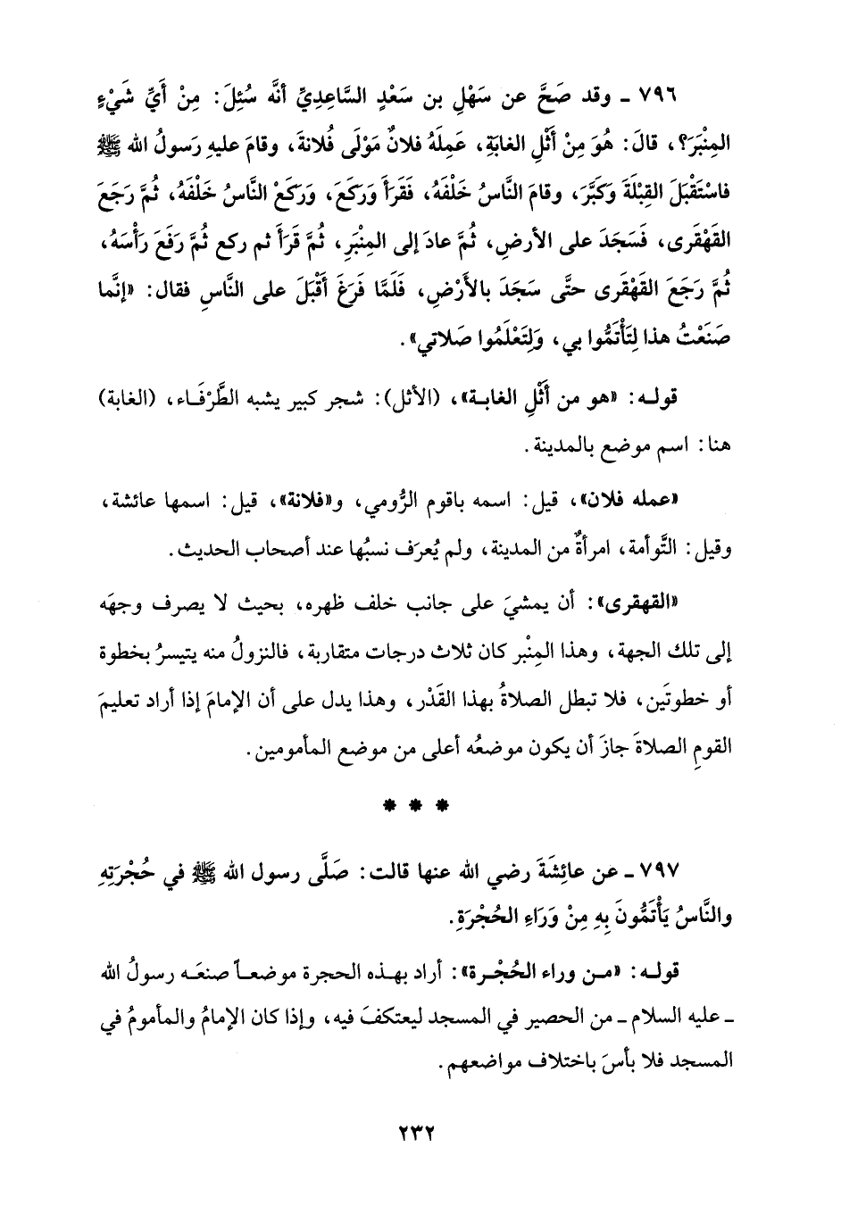 796 - وقد صَحَّ عن سَهْلِ بن سَعْدٍ السَّاعِدِيِّ أنَّه سُئِلَ: مِنْ أَيِّ شَيْءٍ المِنْبَرَ؟، قالَ: هُوَ مِنْ أَثْلِ الغابَةِ، عَمِلَهُ فلانٌ مَوْلَى فُلانةَ، وقامَ عليهِ رَسولُ الله - صلى الله عليه وسلم - فاسْتَقْبَلَ القِبْلَةَ وَكَبَّرَ، وقامَ النَّاسُ خَلْفَهُ، فَقَرَأَ وَرَكَعَ، وَرَكَعْ النَّاسُ خَلْفَهُ، ثُمَّ رَجَعَ القَهْقَرى، فَسَجَدَ على الأرضِ، ثُمَّ عادَ إلى المِنْبَرِ، ثُمَّ قَرَأَ ثم ركع ثُمَّ رَفَعَ رَأْسَهُ، ثُمَّ رَجَعَ القَهْقَرى حتَّى سَجَدَ بالأَرْضِ، فَلَمَّا فَرَغَ أَقْبَلَ على النَّاسِ فقال: "إنَّما صَنَعْتُ هذا لِتَأْتَمُّوا بي، وَلِيتَعْلَمُوا صَلاتي".