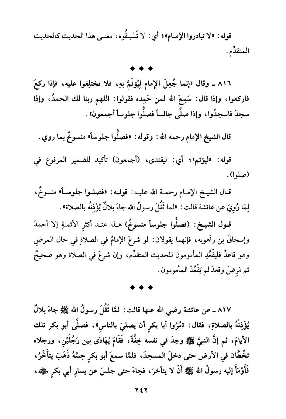 قول الشيخ: (فصلُّوا جلوسًا منسوخٌ) هذا عند أكثرِ الأئمةِ إلا أحمدَ وإسحاقَ بن راَهويه، فإنهما يقولان: لو شرعَ الإمامُ في الصلاةِ في حال المرضِ وهو قاعدٌ فليقْعُدِ المأمومون للحديث المتقدِّم، وإن شرعَ في الصلاة وهو صحيحٌ ثم مَرِضَ وقعدَ لم يَقْعُدْ المأمومون.