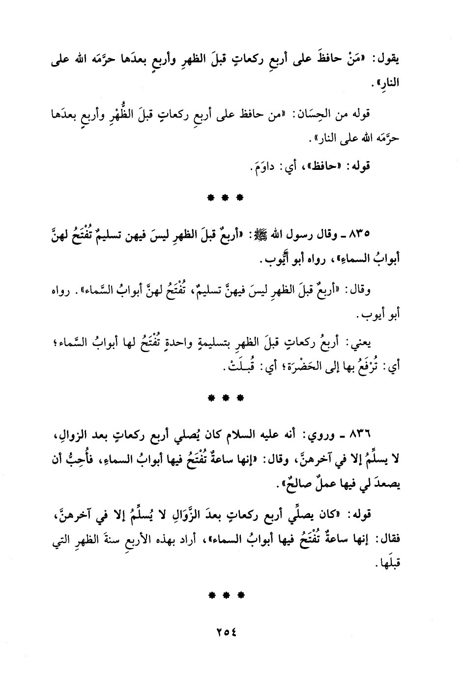 836 - وروي: أنه عليه السلام كان يُصلي أربع ركعاتٍ بعد الزوالِ، لا يسلِّمُ إلا في آخرهنَّ، وقال: "إنها ساعةٌ تُفْتَحُ فيها أبوابُ السماءِ فأُحِبُّ أن يصعدَ لي فيها عملٌ صالحٌ".