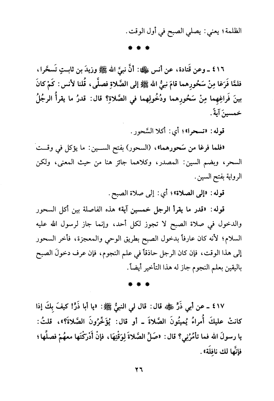 416 - وعن قَتادة، عن أنس - رضي الله عنهما -: أنَّ نبيَّ الله - صلى الله عليه وسلم - وزيدَ بن ثابتٍ تَسحَّرا، فلمَّا فَرَغا مِنْ سَحُورِهما قامَ نبيُّ الله - صلى الله عليه وسلم - إلى الصَّلاةِ فصلَّى، قُلنا لأنس: كَمْ كانَ بينَ فَراغِهِما مِنْ سَحُورِهما ودُخُولِهما في الصَّلاةِ؟ قال: قدرُ ما يقرأُ الرجُلُ خمسينَ آيةً.