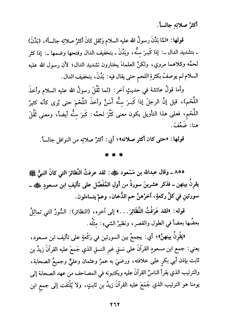 855 - وقال عبد الله بن مَسْعود - رضي الله عنه -: لقد عرفتُ النَّظائرَ التي كانَ النبيُّ - صلى الله عليه وسلم - يقرِنُ بينهن - فذكر عشرينَ سورةً من أولِ المُفَصَّل على تأليفِ ابن مسعودٍ - رضي الله عنه - سورتينِ في كلِّ ركعةٍ، آخرُهنَّ حم الدُّخان، وعمَّ يتساءلون.