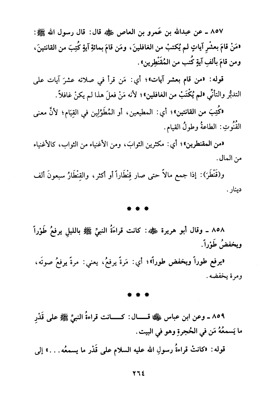 857 - عن عبد الله بن عَمرو بن العاص - رضي الله عنه - قال: قال رسول الله - صلى الله عليه وسلم -: "مَنْ قامَ بعشْرِ آياتٍ لم يُكتبْ من الغافلينَ، ومَن قامَ بمائةِ آيةٍ كُتِبَ من القانتينَ، ومن قامَ بألفِ آيةٍ كُتب من المُقَنْطِرين".