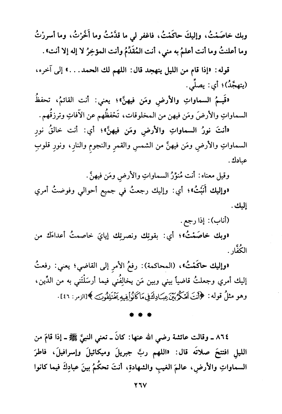 864 - وقالت عائشة رضي الله عنها: كانَ - تعني النبيَّ - صلى الله عليه وسلم - إذا قامَ من الليلِ افتتحَ صلاتَه قال: "اللهم ربَّ جبريلَ وميكائيلَ وإسرافيلَ، فاطرَ السماواتِ والأرضِ، عالمَ الغيبِ والشهادةِ، أنتَ تحكُمُ بينَ عبادِكَ فيما كانوا