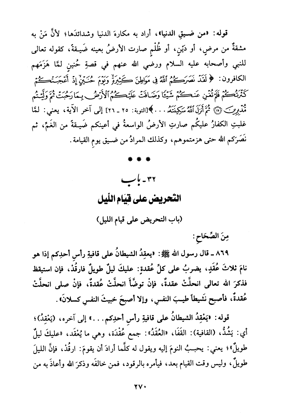 869 - قال رسول الله - صلى الله عليه وسلم -: "يعقِدُ الشيطانُ على قافيةِ رأسِ أحدِكم إذا هو نامَ ثلاثَ عُقَدٍ، يضربُ على كلِّ عُقدةٍ: عليكَ ليلٌ طويلٌ فارقُدْ، فإن استيقظ فذكرَ الله تعالى انحلَّتْ عقدةٌ، فإنْ توضَّأَ انحلَّتْ عُقدةٌ، فإنْ صلى انحلَّتْ عُقدةٌ، فأصبح نَشيطًا طيبَ النفسِ، وإلا أصبحَ خبيثَ النفسِ كسلانَ".