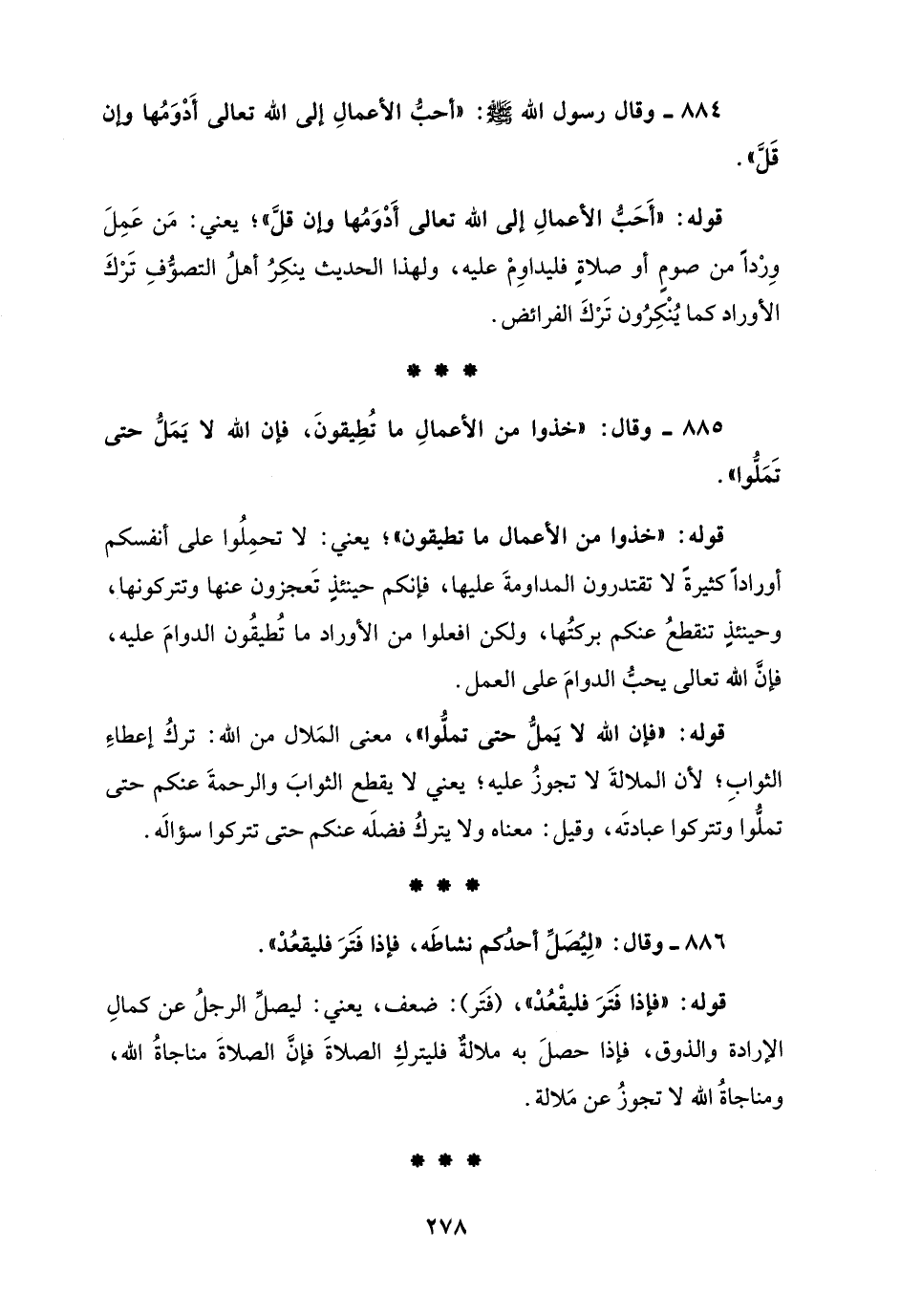 884 - وقال رسول الله - صلى الله عليه وسلم -: "أحبُّ الأعمالِ إلى الله تعالى أَدْوَمُها وإن قَلَّ".