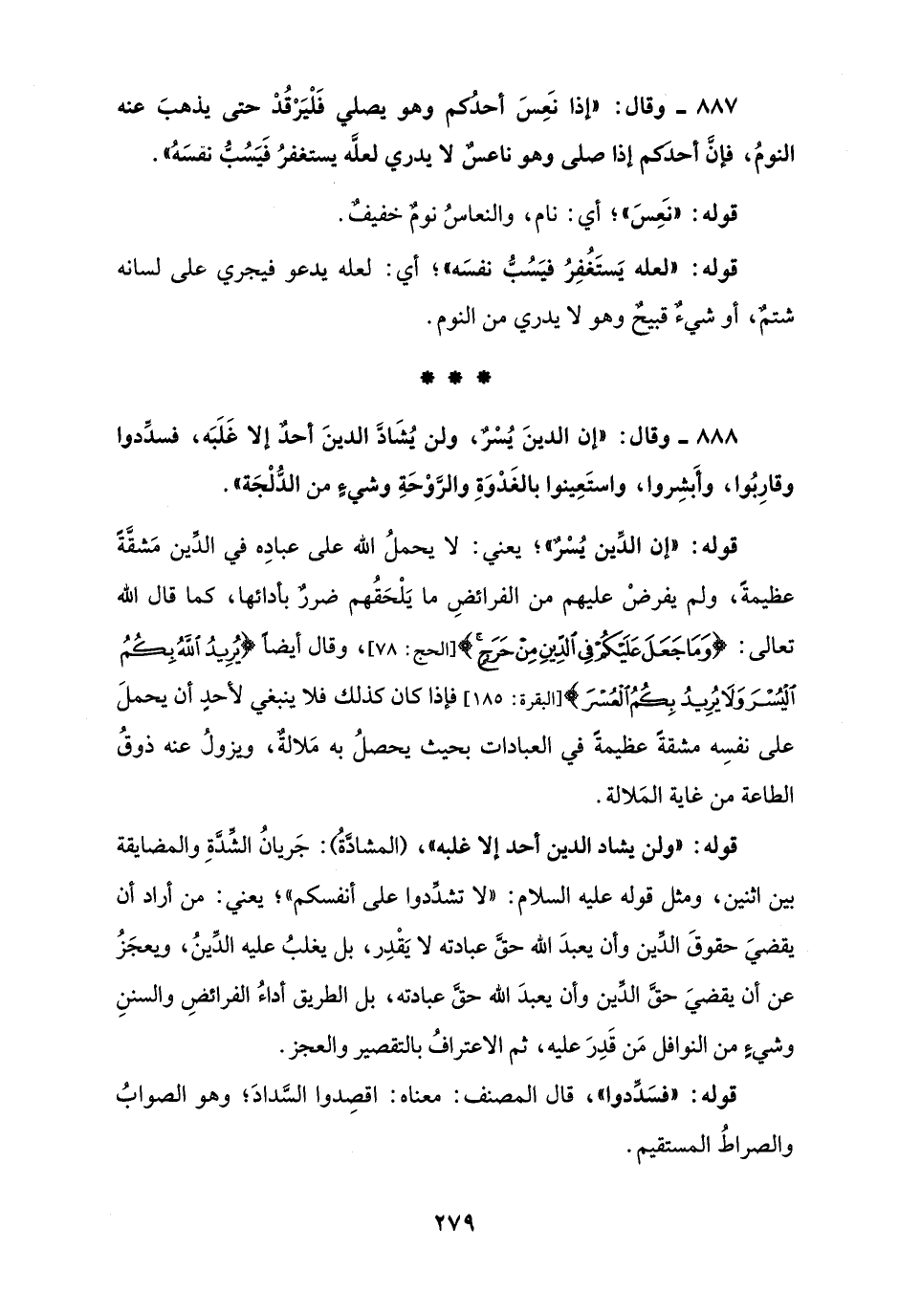 888 - وقال: "إن الدينَ يُسْرٌ، ولن يُشَادَّ الدينَ أحدٌ إلا غَلَبَه، فسدِّدوا وقارِبُوا، وأَبشِروا، واستَعِينوا بالغَدْوَةِ والرَّوْحَةِ وشيءٍ من الدُّلْجَة".