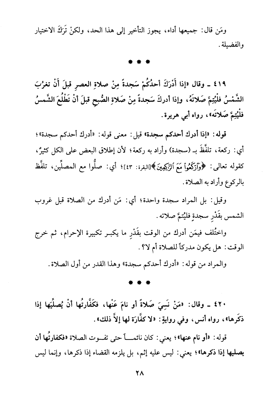 419 - وقال "إذا أَدْرَكَ أحدُكُمْ سَجدةً مِنْ صلاةِ العصرِ قبلَ أَنْ تغرُبَ الشَّمْسُ فلْيُتِمَّ صَلاتَهُ، وإذا أدركَ سَجدةً مَنْ صَلاةِ الصُّبحِ قبلَ أنْ تَطْلُعَ الشَّمسُ فلْيُتِمَّ صَلاتَه"، رواه أبي هريرة.