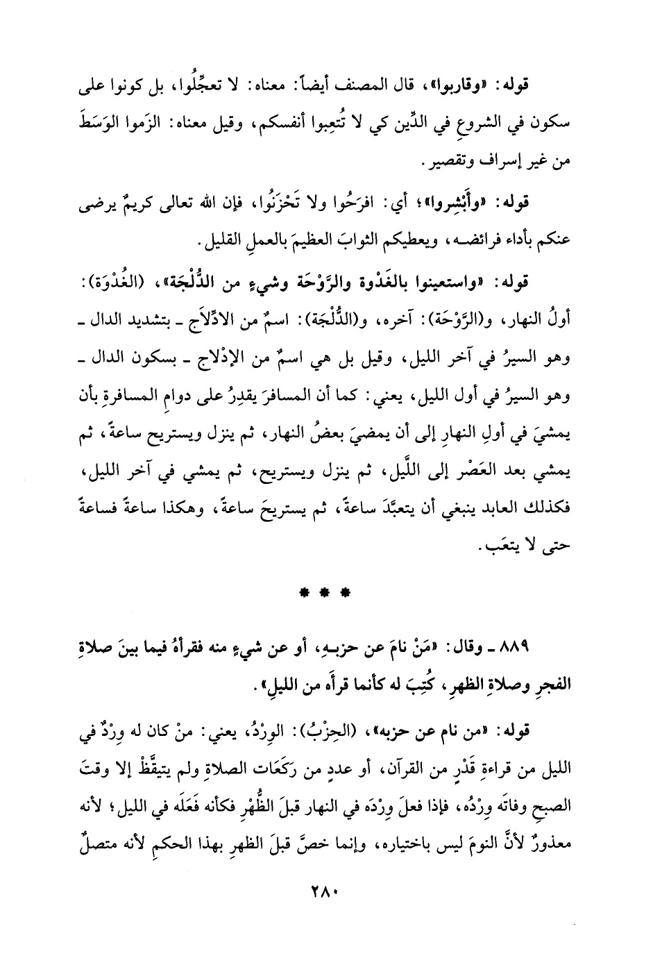 قوله: "واستعينوا بالغَدْوة والرَّوْحَة وشيءٍ من الدُّلْجَة"، (الغُدْوَة): أولُ النهار، و (الرَّوْحَة): آخره، و (الدُّلْجَة): اسم من الادِّلاَج - بتشديد الدال - وهو السيرُ في آخر الليل، وقيل بل هي اسمٌ من الإدْلاج - بسكون الدال - وهو السيرُ في أول الليل، يعني: كما أن المسافرَ يقدِرُ على دوامِ المسافرةِ بأن يمشيَ في أولِ النهارِ إلى أن يمضيَ بعضُ النهار، ثم ينزل ويستريح ساعةً، ثم يمشي بعد العَصْر إلى اللَّيل، ثم ينزل ويستريح، ثم يمشي في آخر الليل، فكذلك العابد ينبغي أن يتعبَّدَ ساعةً، ثم يستريحَ ساعةً، وهكذا ساعةً فساعةً حتى لا يتعَب.