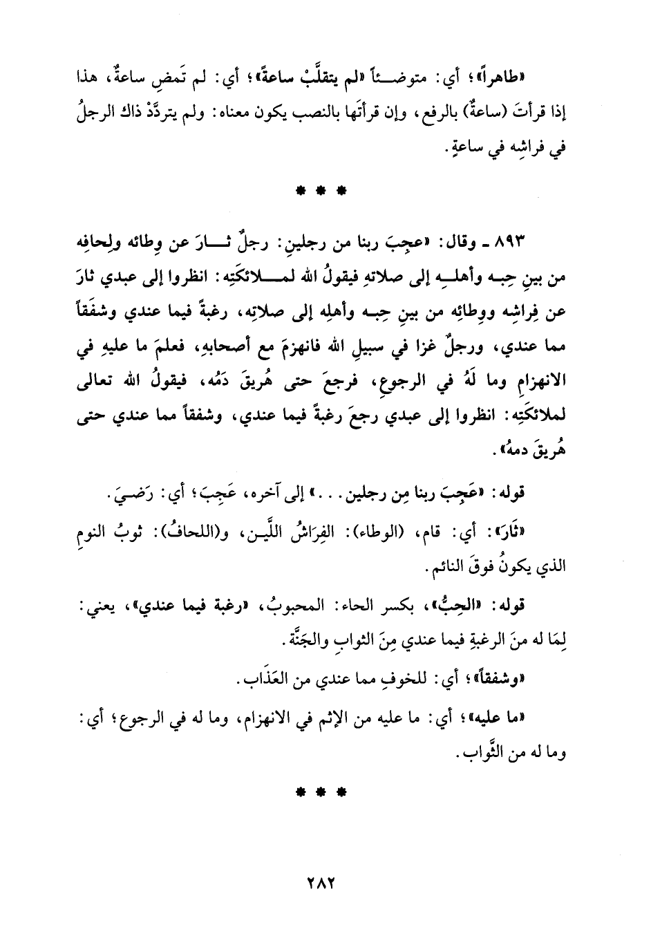 893 - وقال: "عجِبَ ربنا من رجلينِ: رجلٌ ثارَ عن وِطائه ولِحافِه من بينِ حِبه وأهلِه إلى صلاتهِ فيقولُ الله لملائكَتِه: انظروا إلى عبدي ثارَ عن فِراشِه ووِطائِه من بينِ حِبه وأهلِه إلى صلاتِه، رغبةً فيما عندي وشفَقًا مما عندي، ورجلٌ غزا في سبيلِ الله فانهزمَ مع أصحابهِ، فعلمَ ما عليهِ في الانهزامِ وما لَهُ في الرجوعِ، فرجعَ حتى هُريقَ دَمُه، فيقولُ الله تعالى لملائكَتِه: انظروا إلى عبدي رجعَ رغبةً فيما عندي، وشفقًا مما عندي حتى هُريقَ دمهُ".