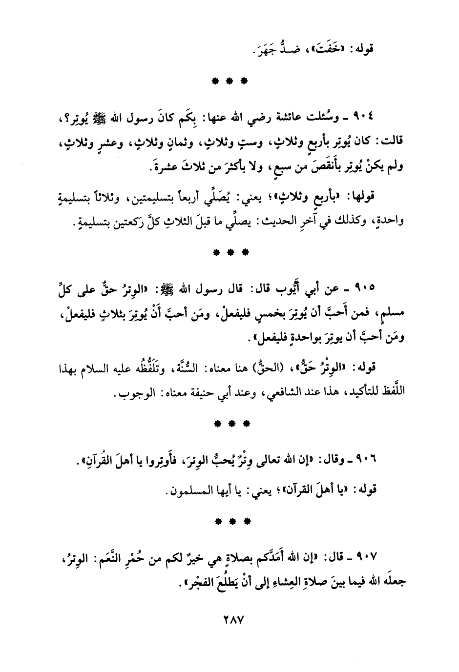 906 - وقال: "إن الله تعالى وِتْرٌ يُحبُّ الوِترَ، فأَوتِروا يا أهلَ القُرآنِ".