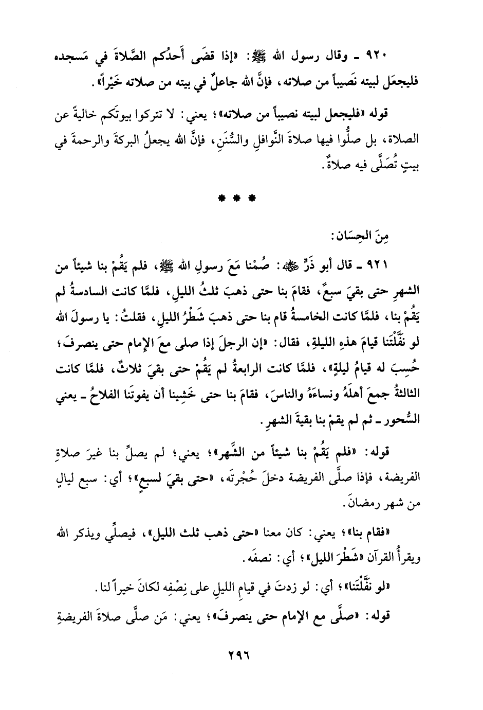 921 - قال أبو ذَرٍّ - رضي الله عنه -: صُمْنا مَعَ رسولِ الله - صلى الله عليه وسلم -، فلم يَقُمْ بنا شيئًا من الشهرِ حتى بقيَ سبعٌ، فقامَ بنا حتى ذهبَ ثلثُ الليلِ، فلمَّا كانت السادسةُ لم يَقُمْ بنا، فلمَّا كانت الخامسةُ قام بنا حتى ذهبَ شَطْرُ الليلِ، فقلتُ: يا رسولَ الله لو نَفَّلْتَنا قيامَ هذهِ الليلةِ، فقال: "إن الرجلَ إذا صلى معَ الإمام حتى ينصرفَ؛ حُسِبَ له قيامُ ليلةٍ"، فلمَّا كانت الرابعةُ لم يَقُمْ حتى بقيَ ثلاثٌ، فلمَّا كانت الثالثةُ جمعَ أهلَهُ ونساءَهُ والناسَ، فقامَ بنا حتى خَشِينا أن يفوتَنا الفلاحُ - يعني السُّحور - ثم لم يقمْ بنا بقيةَ الشهرِ.