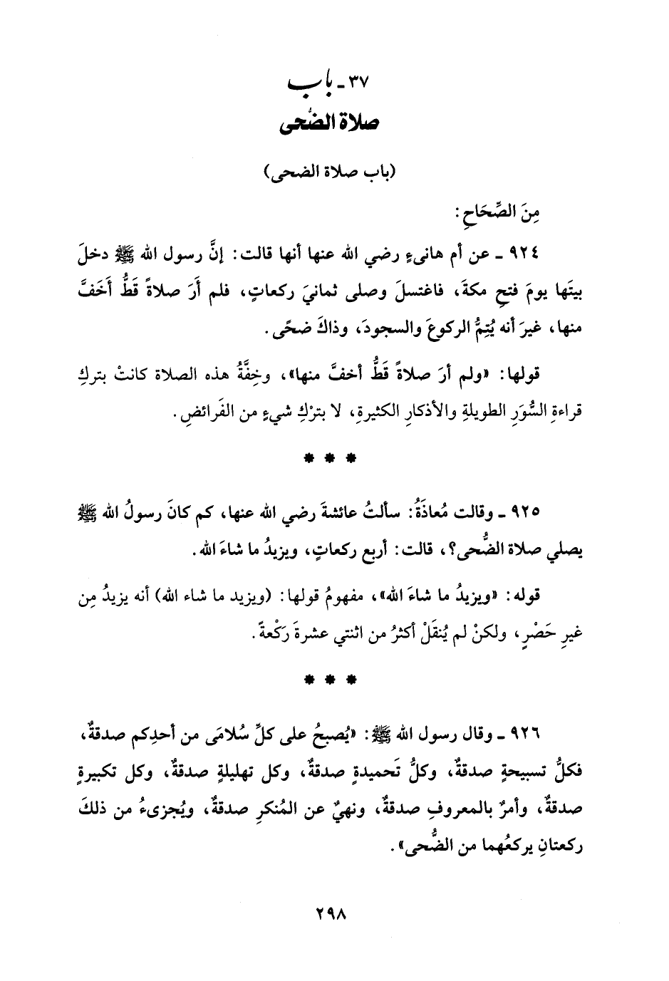 926 - وقال رسول الله - صلى الله عليه وسلم -: "يُصبحُ على كلِّ سُلامَى من أحدِكم صدقةٌ، فكلُّ تسبيحةٍ صدقةٌ، وكلُّ تَحميدةٍ صدقةٌ، وكل تهليلةٍ صدقةٌ، وكل تكبيرةٍ صدقةٌ، وأمرٌ بالمعروفِ صدقةٌ، ونهيٌ عن المُنكرِ صدقةٌ، ويُجزئُ من ذلكَ ركعتانِ يركعُهما من الضُّحى".