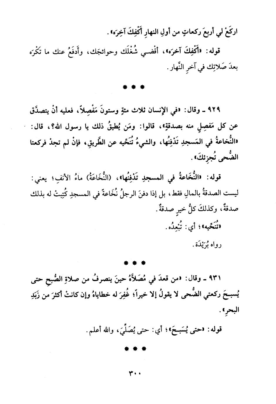 929 - وقال: "في الإِنسان ثلاث مئةٍ وستونَ مَفْصِلًا، فعليه أنْ يتصدَّق عن كل مَفصِلٍ منه بصدقةٍ"، قالوا: ومَن يُطيقُ ذلك يا رسول الله؟، قال: "النُّخاعةُ في المَسجدِ تَدْفِنُها، والشيءُ تُنَحِّيه عن الطَّريقِ, فإنْ لم تجدْ فركعتا الضُّحى تُجزِئكَ".