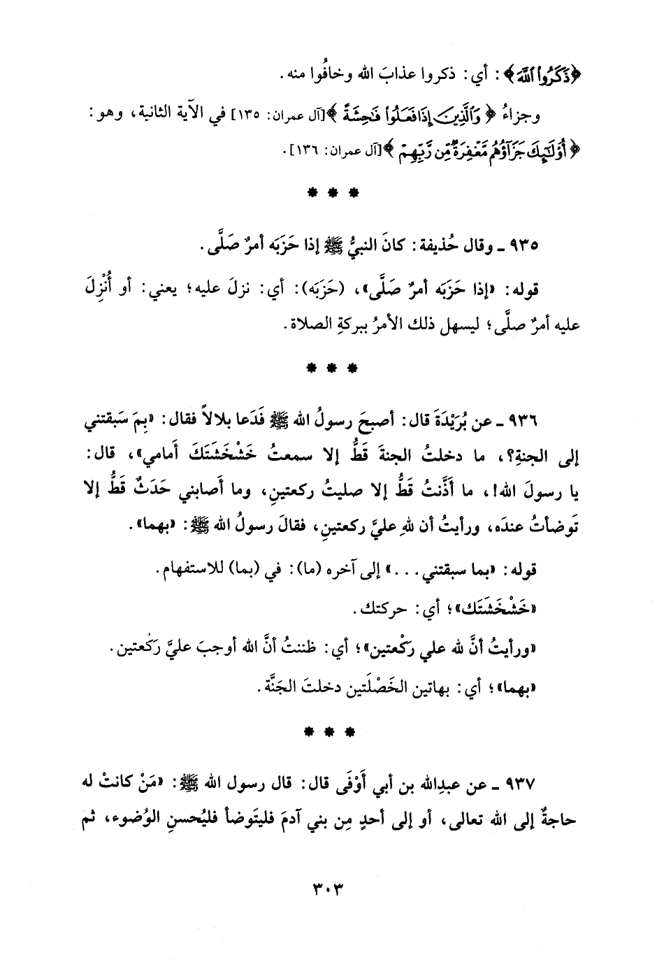 936 - عن بُرَيْدَةَ قال: أصبحَ رسولُ الله - صلى الله عليه وسلم - فَدَعا بلالًا فقال: "بِمَ سَبقتني إلى الجنةِ؟، ما دخلتُ الجنةَ قَطُّ إلا سمعتُ خَشْخَشَتَكَ أَمامي"، قال: يا رسولَ الله!، ما أَذَّنتُ قَطُّ إلا صليتُ ركعتينِ، وما أَصابني حَدَثٌ قَطُّ إلا تَوضأتُ عندَه، ورأيتُ أن للهِ عليَّ ركعتينِ، فقالَ رسولُ الله - صلى الله عليه وسلم -: "بهما".