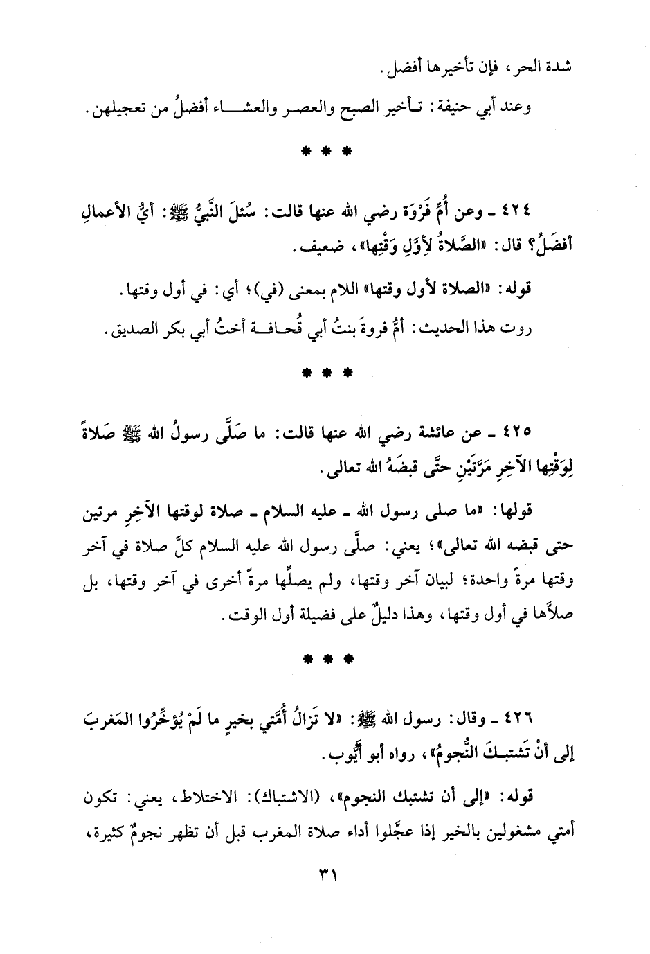 425 - عن عائشة رضي الله عنها قالت: ما صَلَّى رسولُ الله - صلى الله عليه وسلم - صَلاةً لِوَقْتِها الآخِرِ مَرَّتَيْنِ حتَّى قبضَهُ الله تعالى.