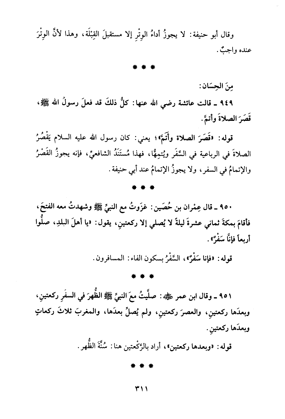 951 - وقال ابن عمر - رضي الله عنه -: صلَّيتُ معَ النبيِّ - صلى الله عليه وسلم - الظُّهرَ في السفَرِ ركعتينِ، وبعدَها ركعتينِ، والعصرَ ركعتينِ، ولم يُصلِّ بعدَها، والمغربَ ثلاثَ ركعاتٍ وبعدَها ركعتينِ.