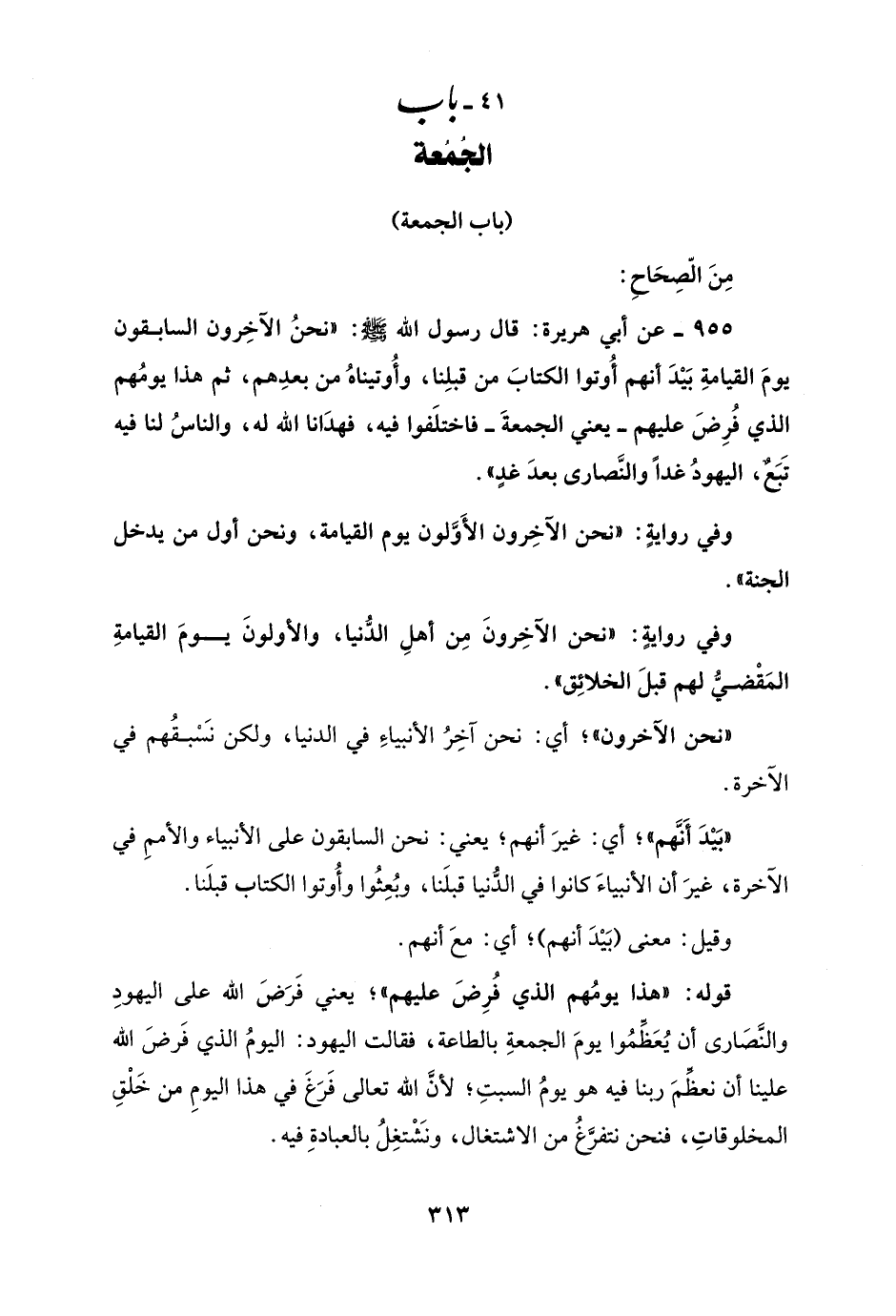 955 - عن أبي هريرة: قال رسول الله - صلى الله عليه وسلم -: "نحنُ الآخِرون السابقون يومَ القيامةِ بَيْدَ أنهم أُوتوا الكتابَ من قبلِنا، وأُوتيناهُ من بعدِهم، ثم هذا يومُهم الذي فُرِضَ عليهم - يعني الجمعةَ - فاختلَفوا فيه، فهدَانا الله له، والناسُ لنا فيه تَبَعٌ، اليهودُ غدًا والنَّصارى بعدَ غدٍ".