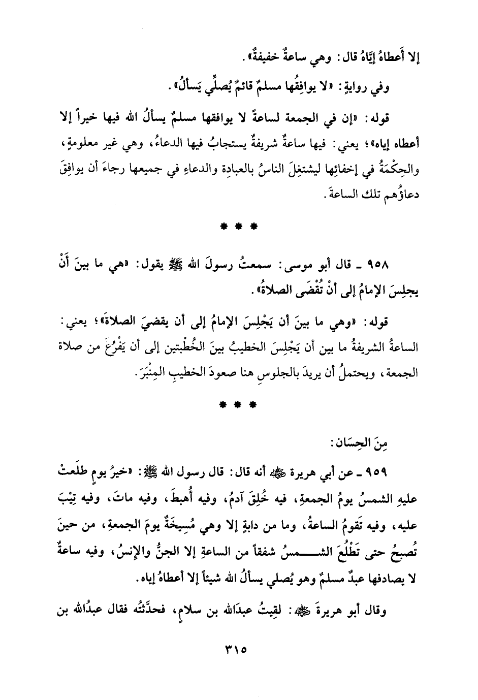 959 - عن أبي هريرة - رضي الله عنه - أنه قال: قال رسول الله - صلى الله عليه وسلم -: "خيرُ يومٍ طلَعتْ عليهِ الشمسُ يومُ الجمعةِ، فيه خُلِقَ آدمُ، وفيه أُهبطَ، وفيه ماتَ، وفيه تِيْبَ عليه، وفيه تَقومُ الساعةُ، وما من دابةٍ إلا وهي مُسِيخَةٌ يومَ الجمعةِ، من حينَ تُصبحُ حتى تَطْلُعَ الشمسُ شفقًا من الساعةِ إلا الجنُّ والإِنسُ، وفيه ساعةٌ لا يصادفها عبدٌ مسلمٌ وهو يُصلي يسألُ الله شيئًا إلا أعطاهُ إياه.