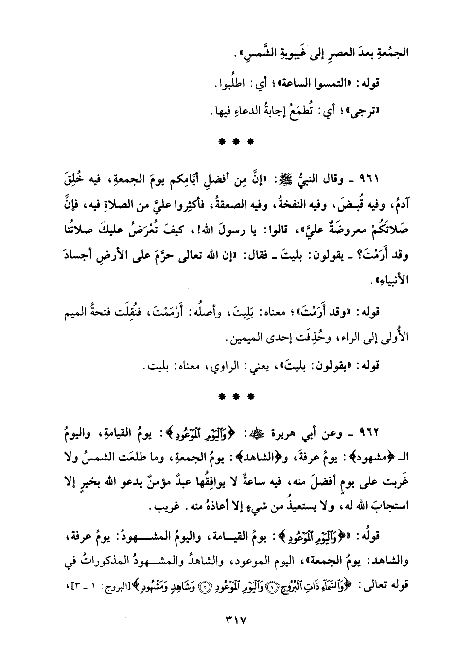962 - وعن أبي هريرة - رضي الله عنه -: {وَالْيَوْمِ الْمَوْعُودِ}: يومُ القيامةِ، واليومُ الـ {مَشْهُودٍ}: يومُ عرفةَ، و {الشاهد}: يومُ الجمعةِ، وما طلعَت الشمسُ ولا غَربت على يومٍ أفضلَ منه، فيه ساعةٌ لا يوافِقُها عبدٌ مؤمنٌ يدعو الله بخيرٍ إلا استجابَ الله له، ولا يستعيذُ من شيءٍ إلا أعاذهُ منه. غريب.