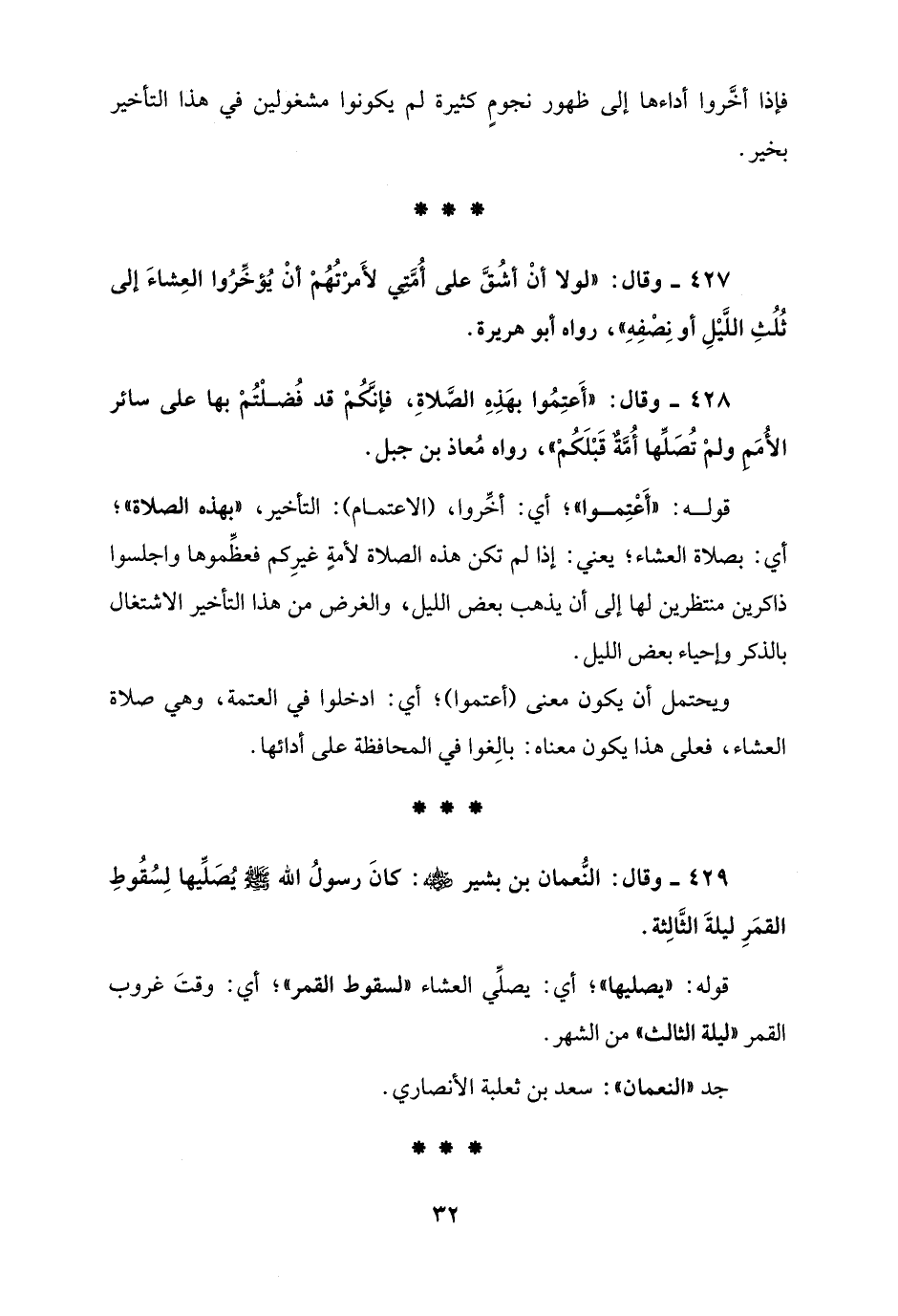 429 - وقال: النُّعمان بن بشير - رضي الله عنه -: كانَ رسولُ الله - صلى الله عليه وسلم - يصَلِّيها لِسُقُوطِ القمَرِ ليلةَ الثَّالِثة.