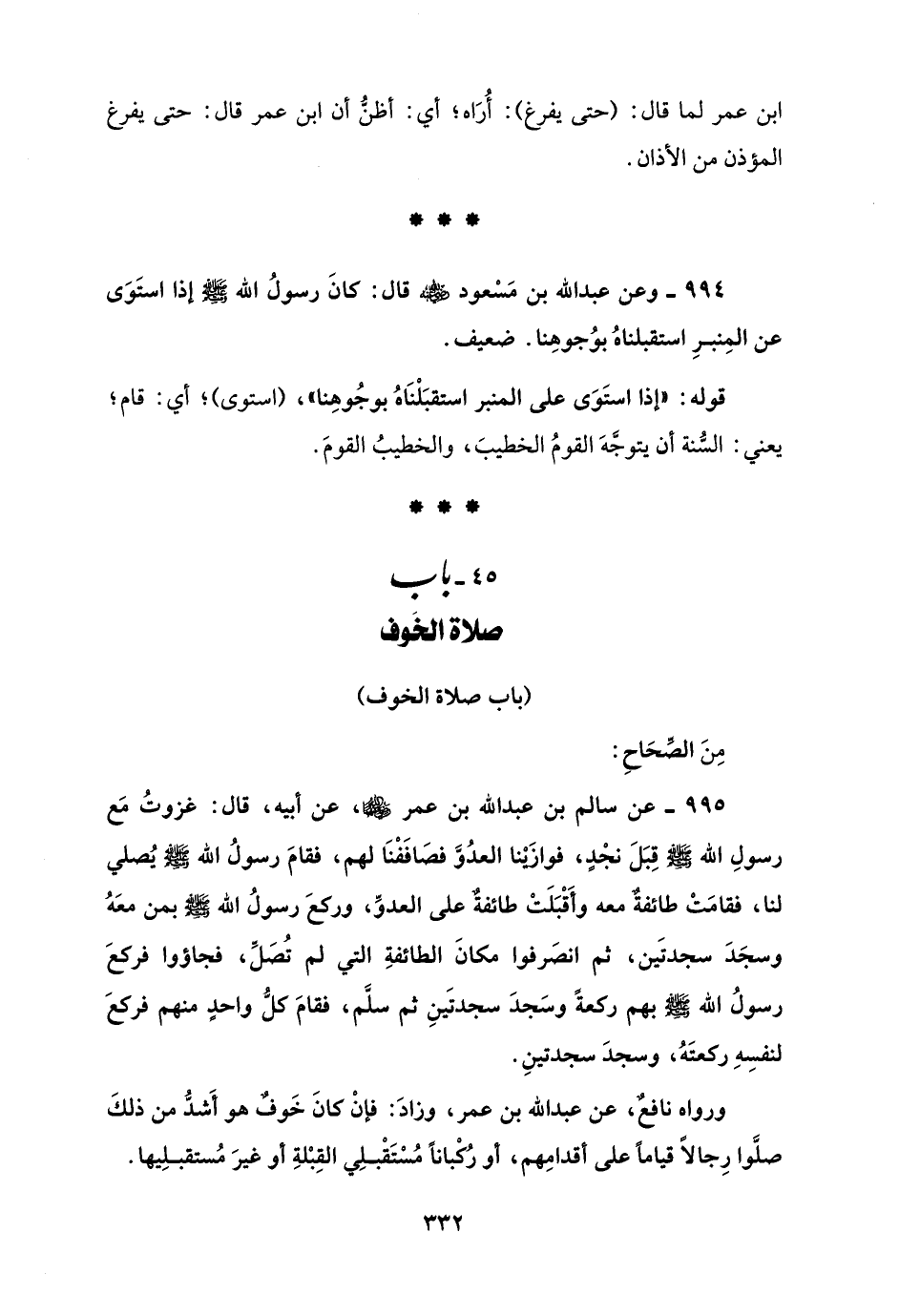 995 - عن سالم بن عبد الله بن عمر - رضي الله عنهما -، عن أبيه، قال: غزوتُ مَع رسولِ الله - صلى الله عليه وسلم - قِبَلَ نجْدٍ، فوازَيْنا العدُوَّ فصَافَفْنَا لهم، فقامَ رسولُ الله - صلى الله عليه وسلم - يُصلي لنا، فقامَتْ طائفةٌ معه وأَقْبَلَتْ طائفةٌ على العدوِّ، وركعَ رسولُ الله - صلى الله عليه وسلم - بمن معَهُ وسجَدَ سجدتَين، ثم انصَرفوا مكانَ الطائفةِ التي لم تُصَلِّ، فجاؤوا فركعَ رسولُ الله - صلى الله عليه وسلم - بهم ركعةً وسَجدَ سجدتَينِ ثم سلَّم، فقامَ كلُّ واحدٍ منهم فركعَ لنفسِهِ ركعتَهُ، وسجدَ سجدتينِ.