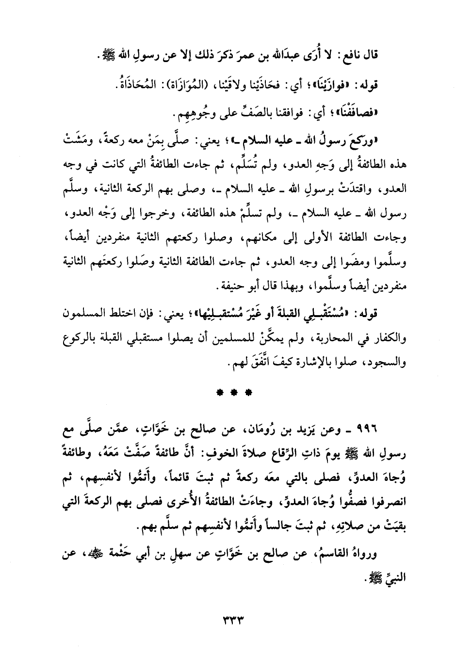 996 - وعن يَزيد بن رُومَان، عن صالح بن خَوَّاتٍ، عمَّن صلَّى مع رسولِ الله - صلى الله عليه وسلم - يومَ ذاتِ الرِّقاع صلاةَ الخوفِ: أنَّ طائفةً صَفَّتْ مَعَهُ، وطائفةً وُجاهَ العدوِّ، فصلى بالتي معَه ركعةً ثم ثبتَ قائمًا، وأَتمُّوا لأنفسِهم، ثم انصرفوا فصفُّوا وُجاهَ العدوِّ، وجاءَتْ الطائفةُ الأُخرى فصلى بهم الركعةَ التي بقيَتْ من صلاتِهِ، ثم ثبتَ جالسًا وأَتمُّوا لأنفسِهم ثم سلَّم بهم.