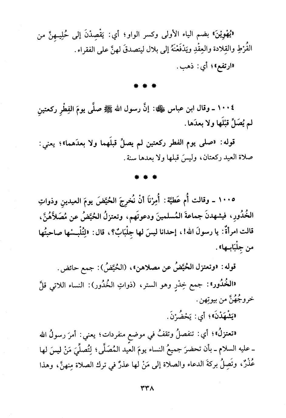 1004 - وقال ابن عباس - رضي الله عنهما -: إنَّ رسول الله - صلى الله عليه وسلم - صلَّى يومَ الفِطْرِ ركعتينِ لم يُصَلِّ قبْلَها ولا بعدَها.