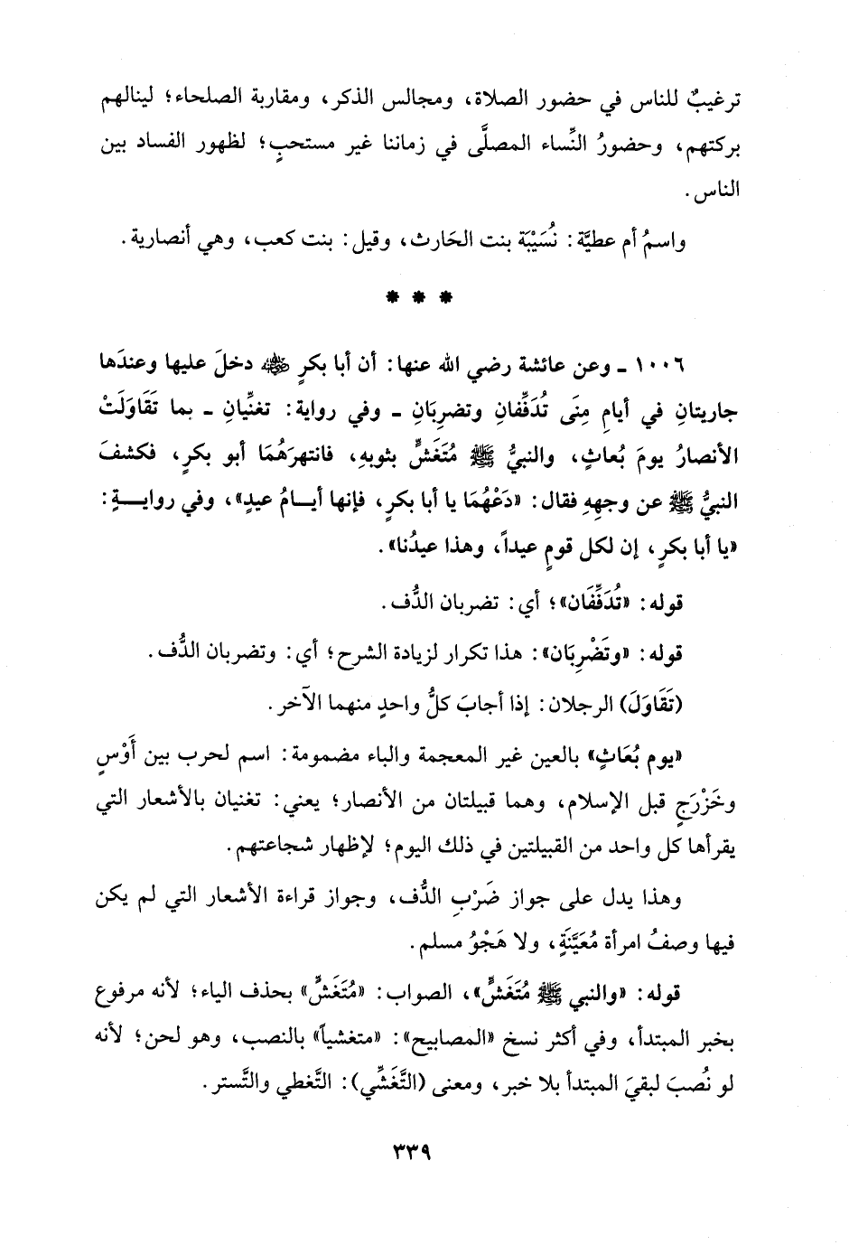 1006 - وعن عائشة رضي الله عنها: أن أبا بكرٍ - رضي الله عنه - دخلَ عليها وعندَها جاريتانِ في أيامِ مِنَى تُدَفِّفانِ وتضرِبَانِ - وفي رواية: تغنِّيانِ - بما تَقَاوَلَتْ الأنصارُ يومَ بُعاثٍ، والنبيُّ - صلى الله عليه وسلم - مُتَغَشٍّ بثوبهِ، فانتهرَهُمَا أبو بكرٍ، فكشفَ النبيُّ - صلى الله عليه وسلم - عن وجهِهِ فقال: "دَعْهُمَا يا أبا بكرٍ، فإنها أيامُ عيدٍ"، وفي روايةٍ: "يا أبا بكرٍ، إن لكل قومٍ عيدًا، وهذا عيدُنا".
