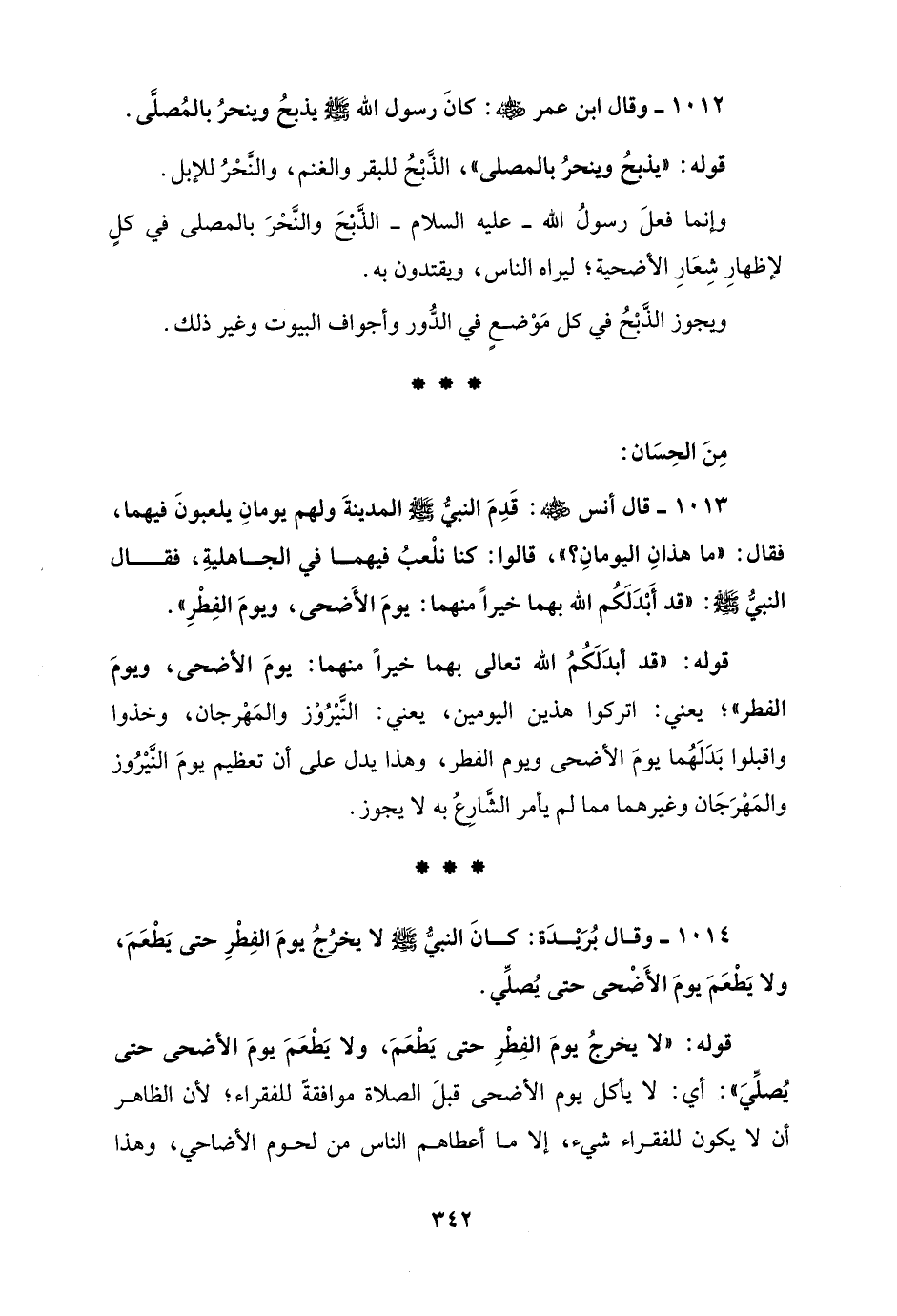 1013 - قال أنس - رضي الله عنه -: قَدِمَ النبيُّ - صلى الله عليه وسلم - المدينةَ ولهم يومانِ يلعبونَ فيهما، فقال: "ما هذانِ اليومانِ؟ "، قالوا: كنا نلْعبُ فيهما في الجاهليةِ، فقال النبيُّ - صلى الله عليه وسلم -: "قد أَبْدَلَكُم الله بهما خيرًا منهما: يومَ الأَضحى، ويومَ الفِطْرِ".