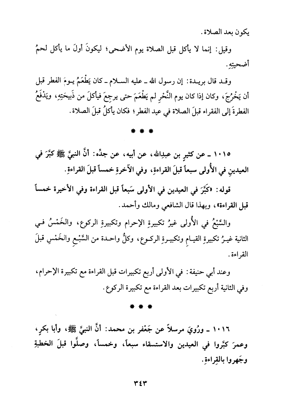 1016 - ورُويَ مرسلاً عن جَعْفر بن محمد: أنَّ النبيَّ - صلى الله عليه وسلم -، وأبا بكرٍ، وعمرَ كبَّروا في العيدين والاستسقاء سبعًا، وخمسًا، وصلَّوا قبلَ الخطبةِ وجَهروا بالقِراءةِ.