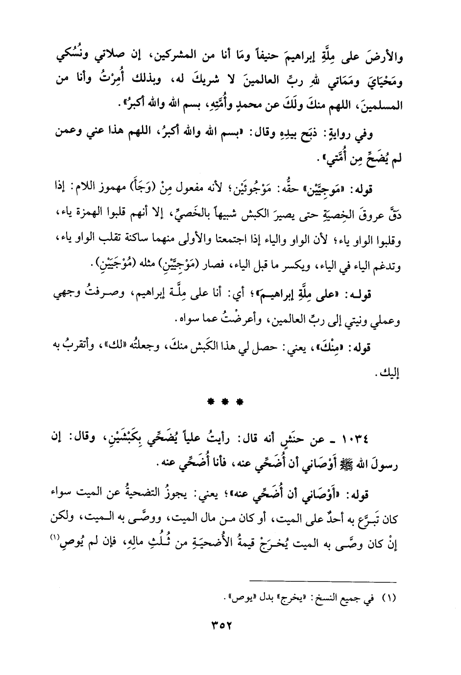 1034 - عن حنَشٍ أنه قال: رأيتُ عليًا يُضَحِّي بِكَبْشَيْنِ، وقال: إن رسولَ الله - صلى الله عليه وسلم - أَوْصَاني أن أُضَحِّي عنه، فأنا أُضَحِّي عنه.
