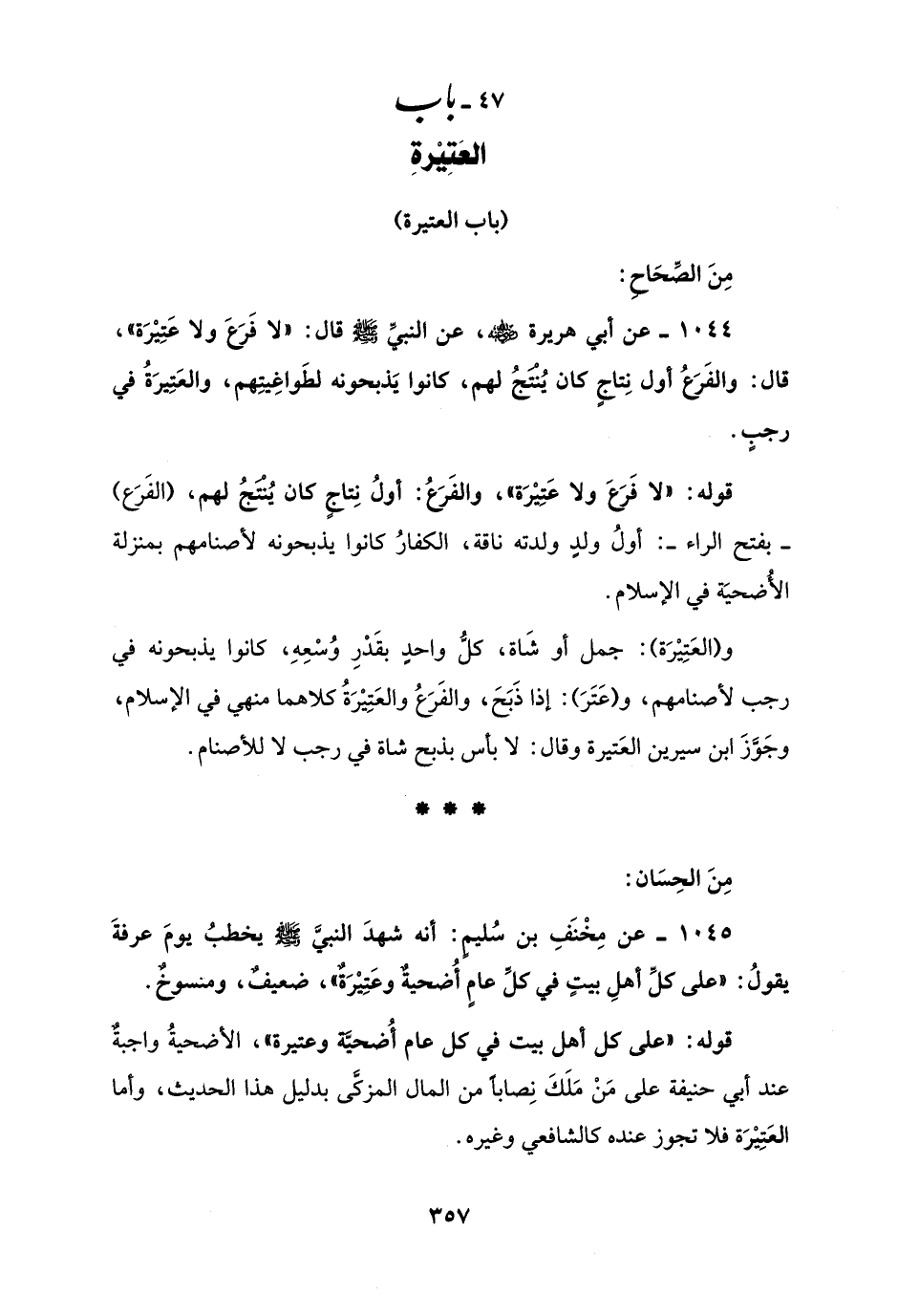 1044 - عن أبي هريرة - رضي الله عنه -، عن النبيِّ - صلى الله عليه وسلم - قال: "لا فَرَعَ ولا عَتِيْرَة"، قال: والفَرَعُ أول نِتاجٍ كان يُنْتَجُ لهم، كانوا يَذبحونه لطَواغِيتِهم، والعَتِيرَةُ في رجبٍ.