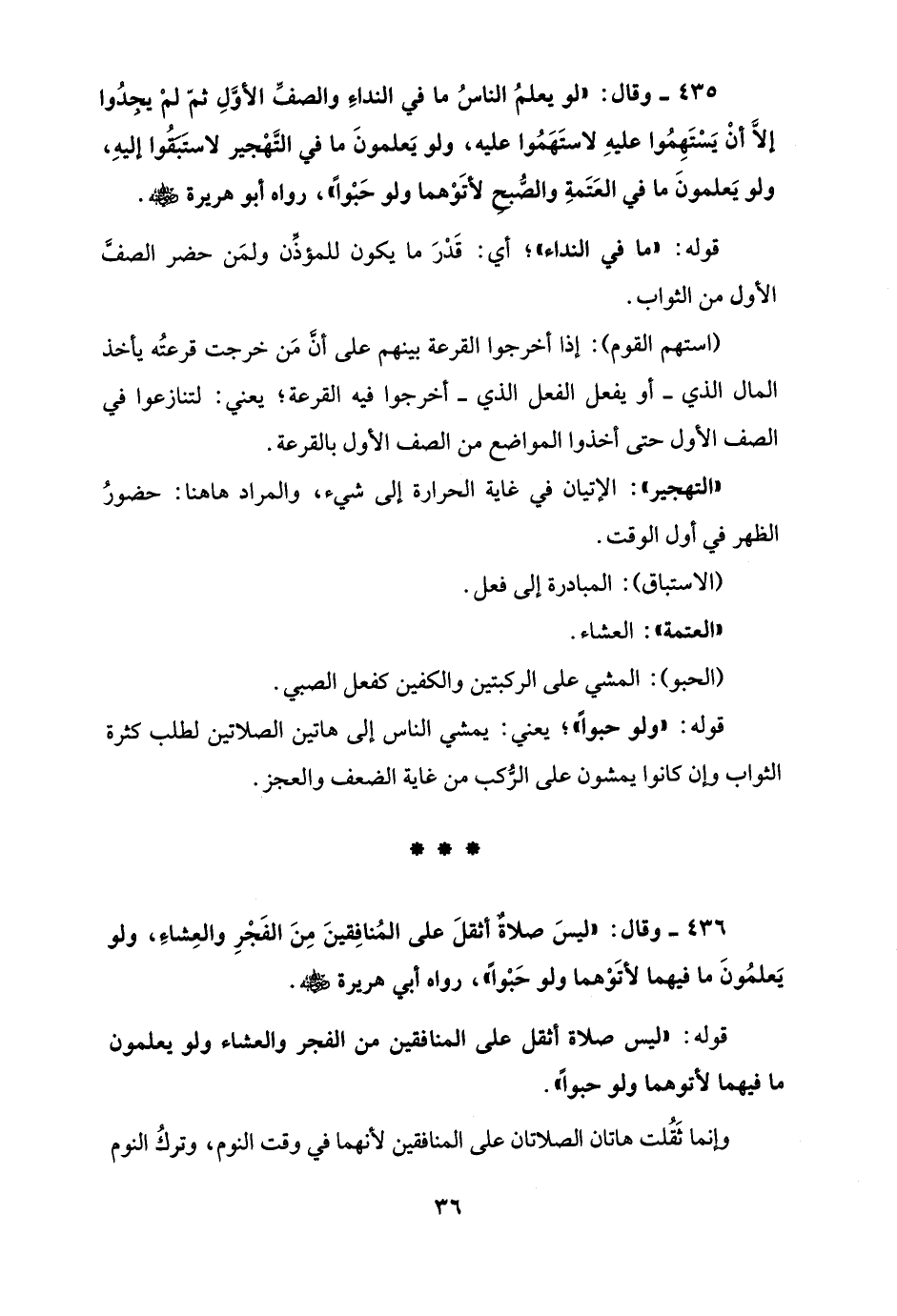 436 - وقال: "ليسَ صلاةٌ أثقلَ على المُنافِقينَ مِنَ الفَجْرِ والعِشاءِ، ولو يَعلمُونَ ما فيهما لأتَوْهما ولو حَبْوًا"، رواه أبي هريرة - رضي الله عنه -.