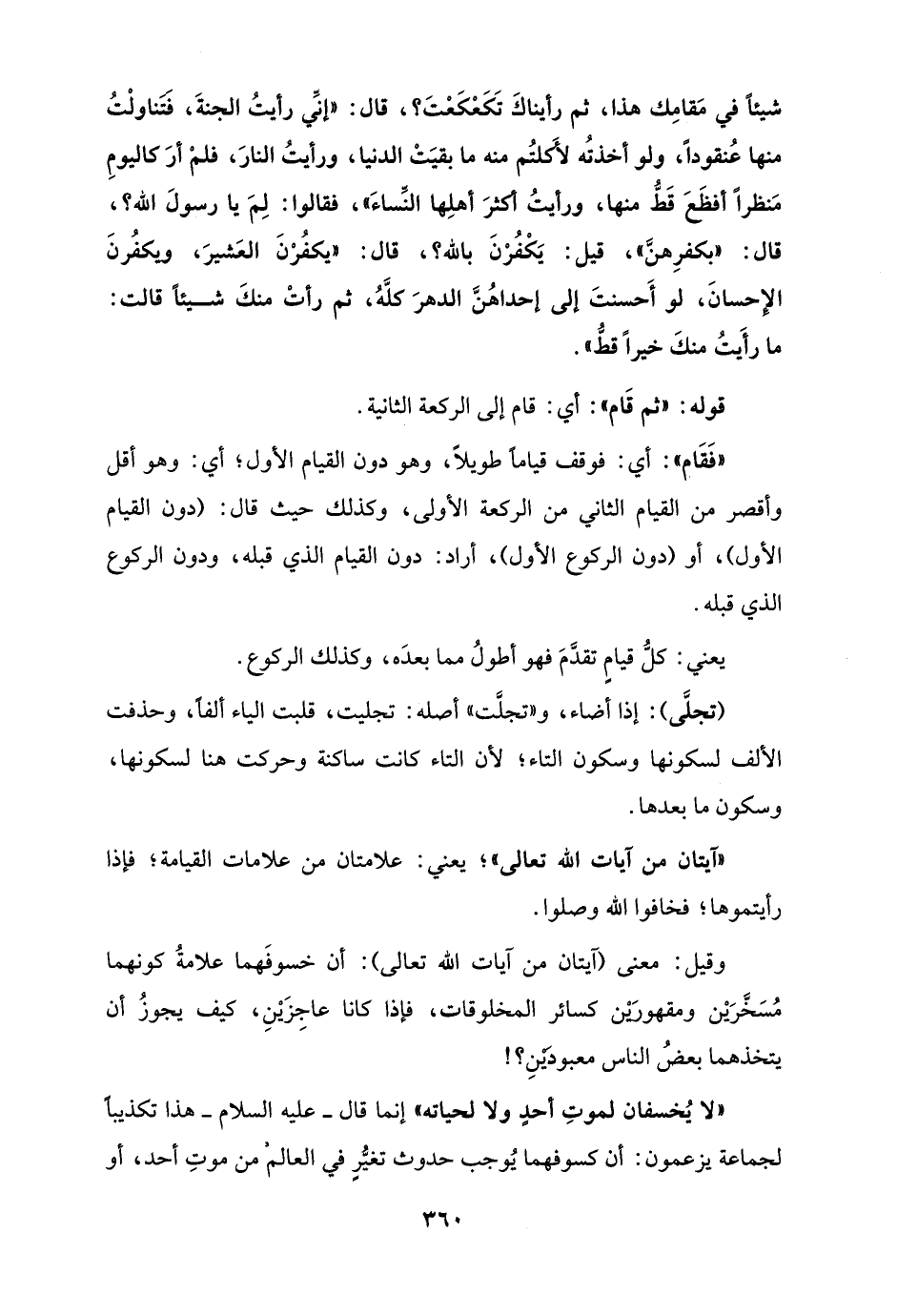 شيئًا في مَقامِك هذا، ثم رأيناكَ تَكَعْكَعْتَ؟، قال: "إنَّي رأيتُ الجنةَ، فَتَناولْتُ منها عُنقودًا، ولو أخذتُه لأَكلتُم منه ما بقيَتْ الدنيا، ورأيتُ النارَ، فلمْ أرَ كاليومِ مَنظرًا أفظَعَ قَطُّ منها، ورأيتُ أكثرَ أهلِها النِّساءَ"، فقالوا: لِمَ يا رسولَ الله؟، قال: "بكفرِهنَّ"، قيل: يَكْفُرْنَ بالله؟، قال: "يكفُرْنَ العَشيرَ، ويكفُرنَ الإحسانَ، لو أَحسنتَ إلى إحداهُنَّ الدهرَ كلَّهُ، ثم رأتْ منكَ شيئًا قالت: ما رأَيتُ منكَ خيرًا قطُّ".